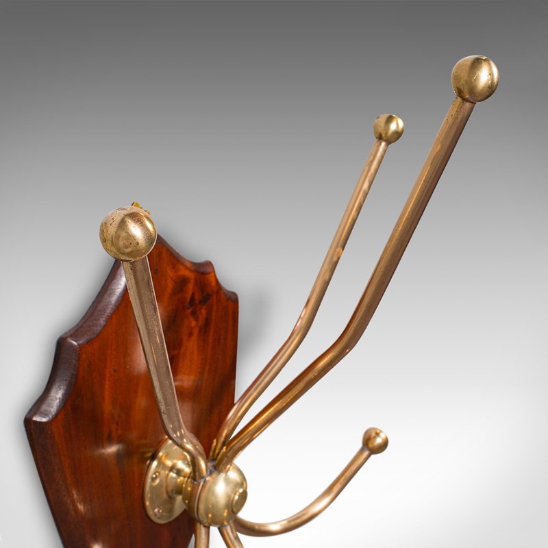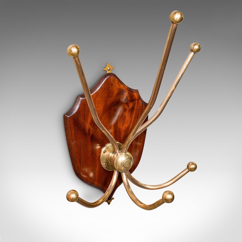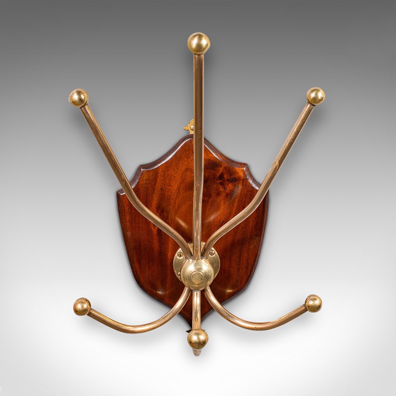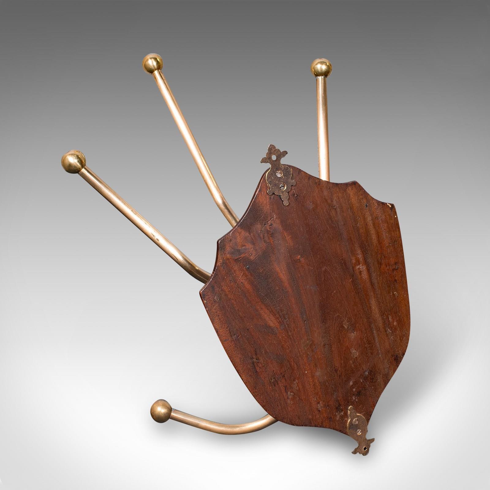 This is a superb antique hunting lodge coat rack. A Scottish, brass and mahogany six branch reception hall shield, dating to the Edwardian period, circa 1910. Exuding the timeless grandeur of a Highland estate, this piece brings stately presence to the entrance hall or country retreat.