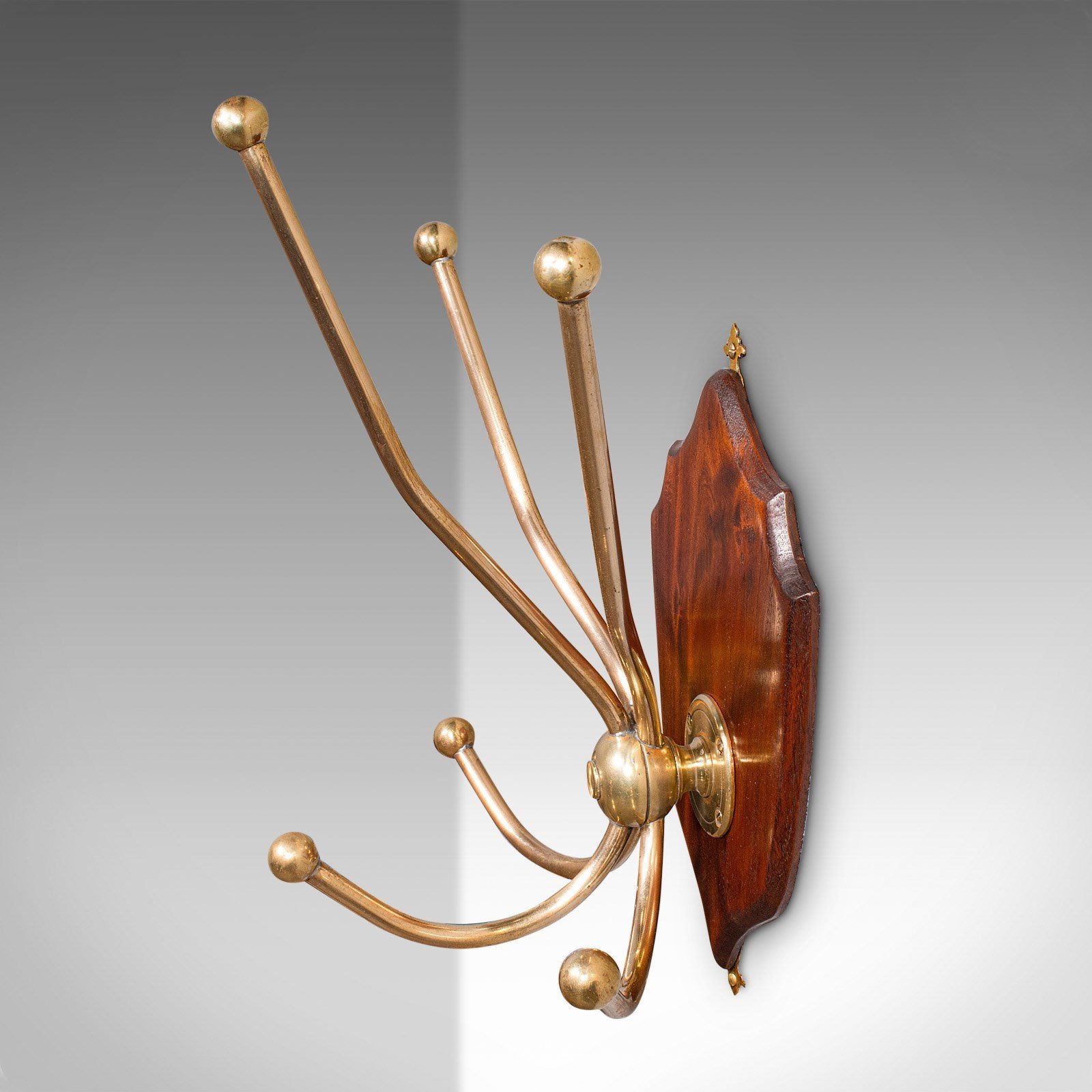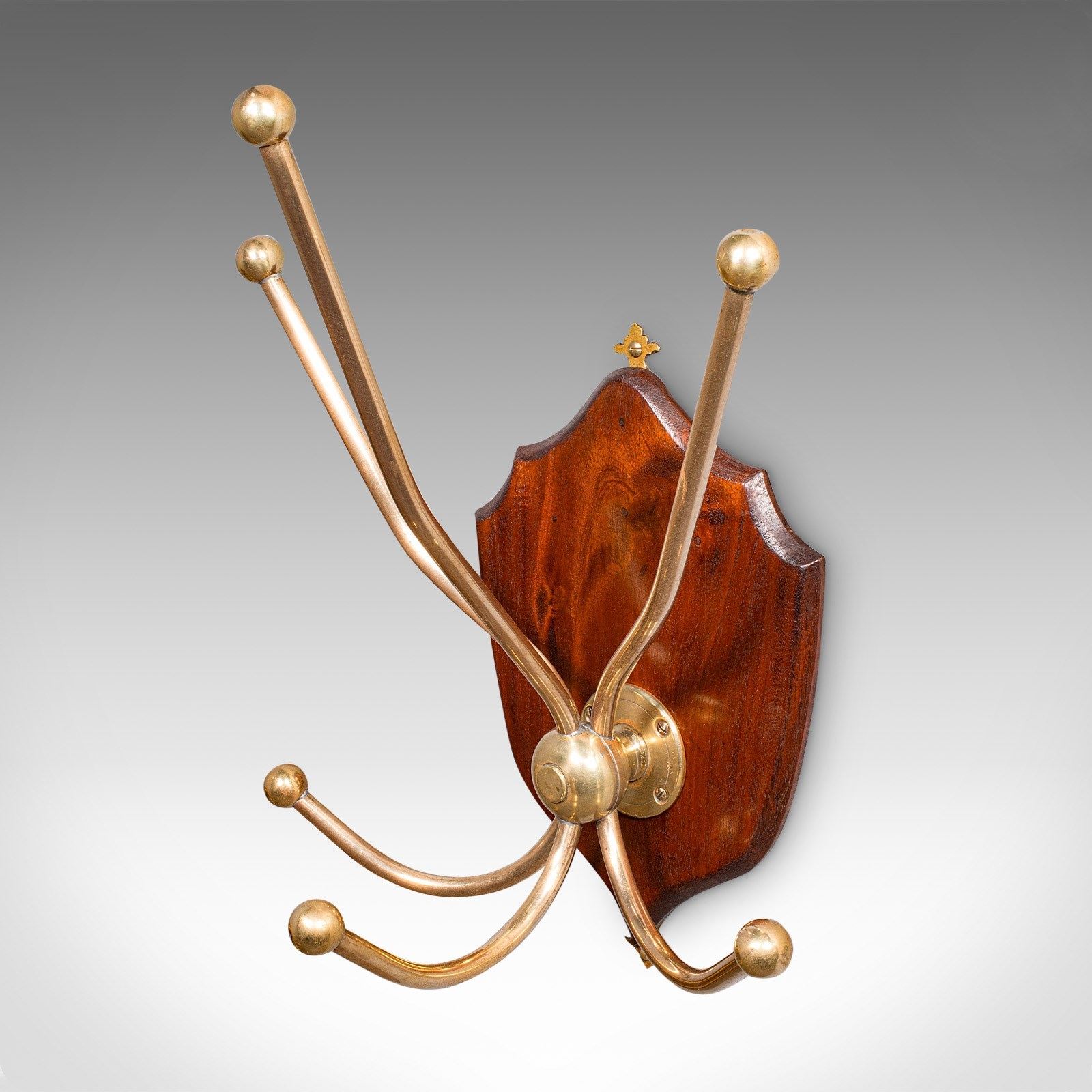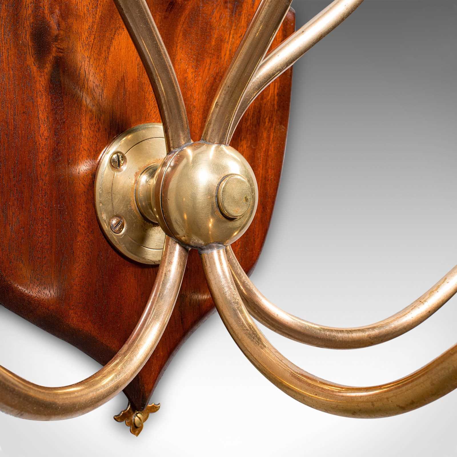 This is a superb antique hunting lodge coat rack. A Scottish, brass and mahogany six branch reception hall shield, dating to the Edwardian period, circa 1910. Exuding the timeless grandeur of a Highland estate, this piece brings stately presence to the entrance hall or country retreat.