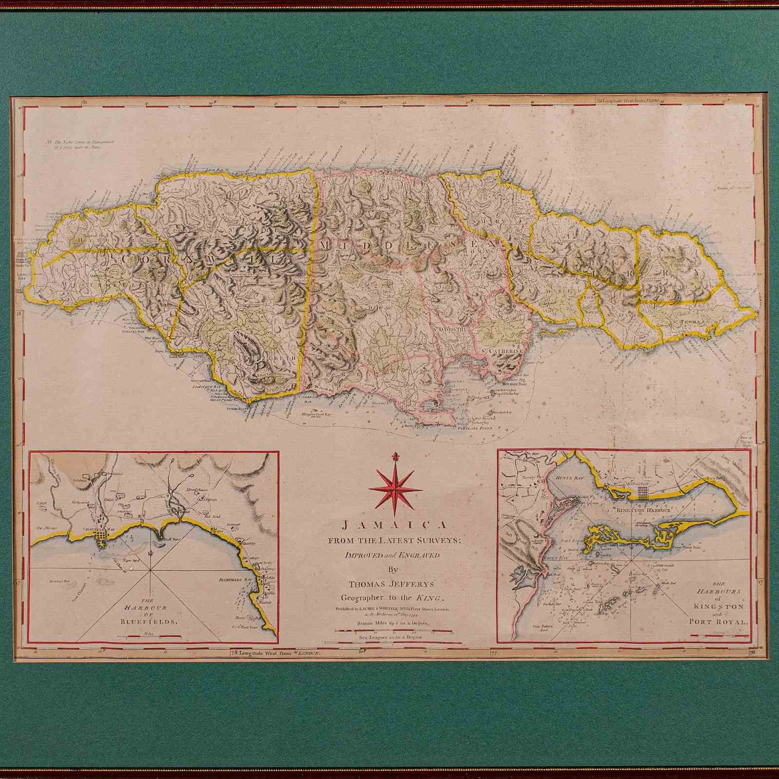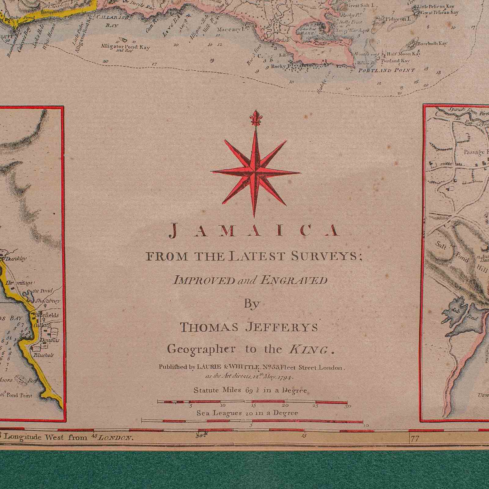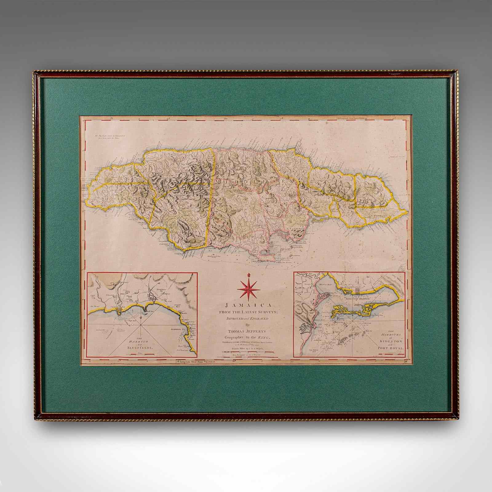 This is an antique Jamaica map. An English, framed Caribbean island engraving by Thomas Jefferys, dating to the 18th century and later, dated 1794.