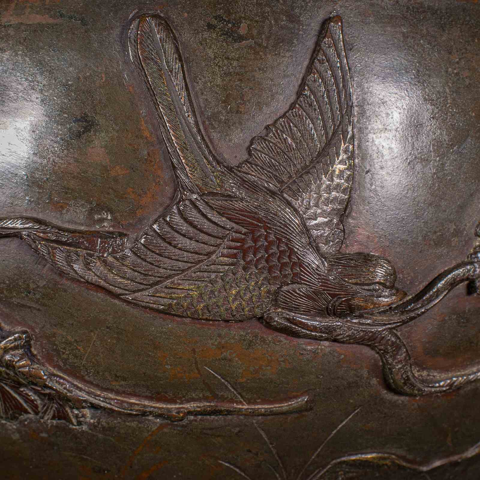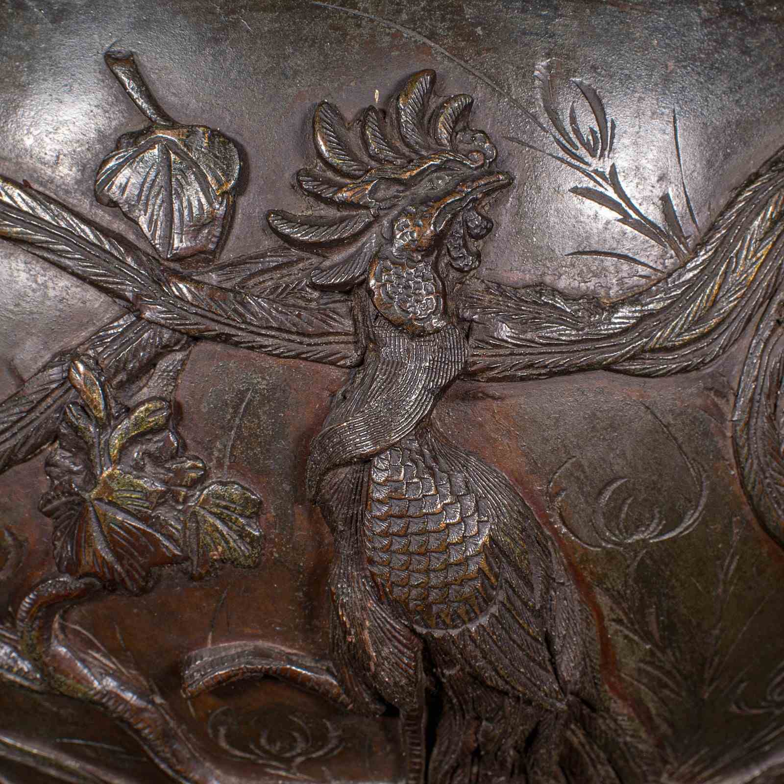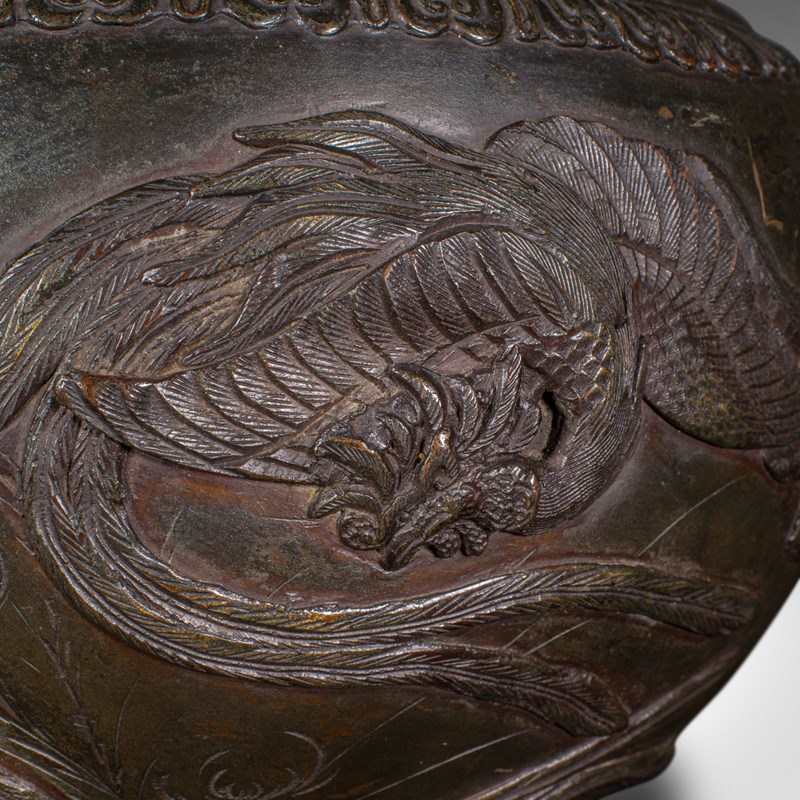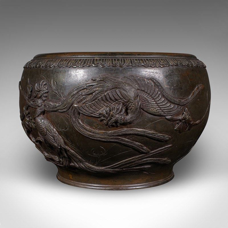 This is a fascinating antique jardiniere bowl, with appealing dragon and bird motif accentuating the colourful weathering of the bronze form. Delivered ready to display.