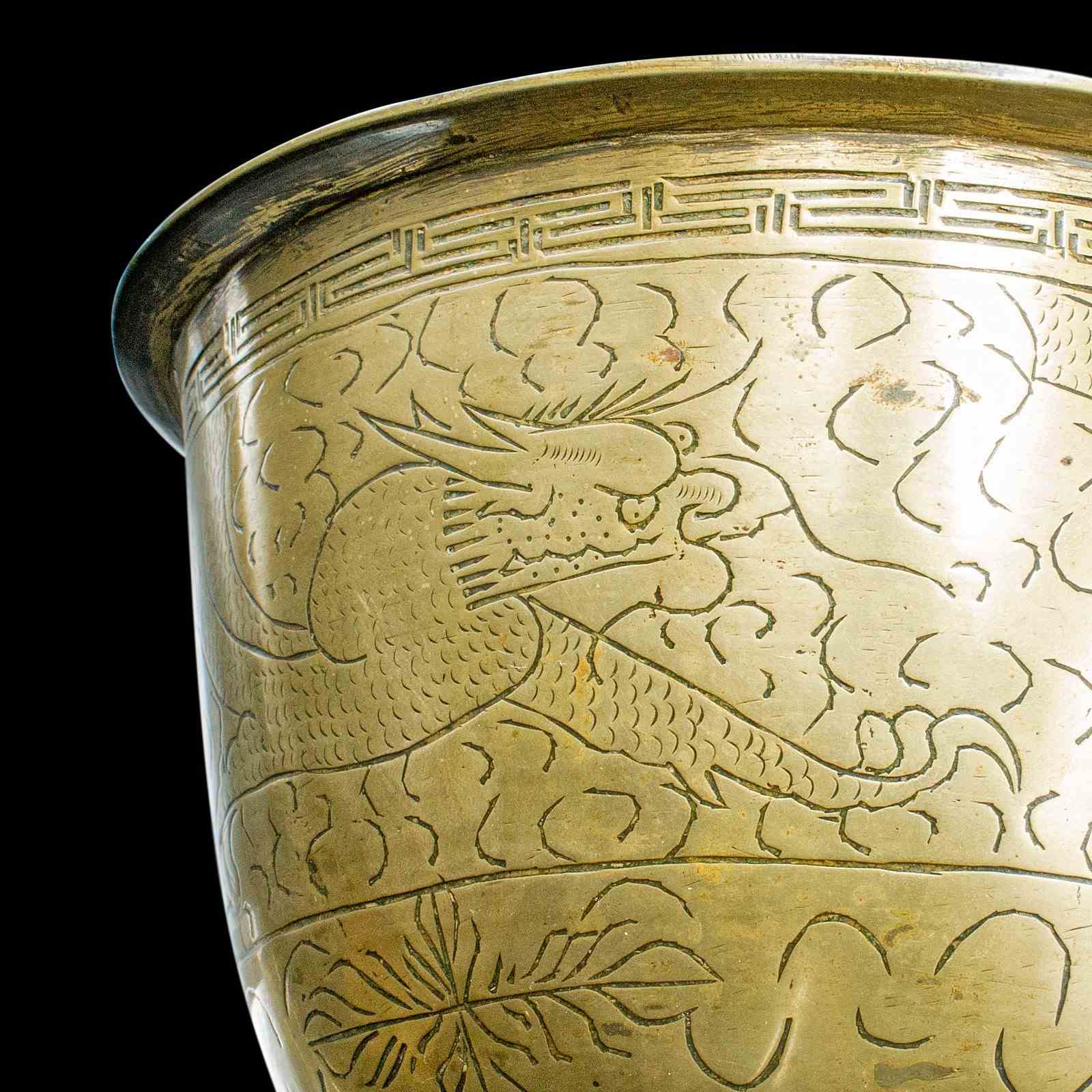 This is an antique jardiniere dish. A Japanese, a bronze Meiji era decorative planter bowl, dating to the late Victorian period, circa 1900. A fine example of Meiji-jidai artistry, showcasing the classic dragon motif alongside foliate and bird decoration.