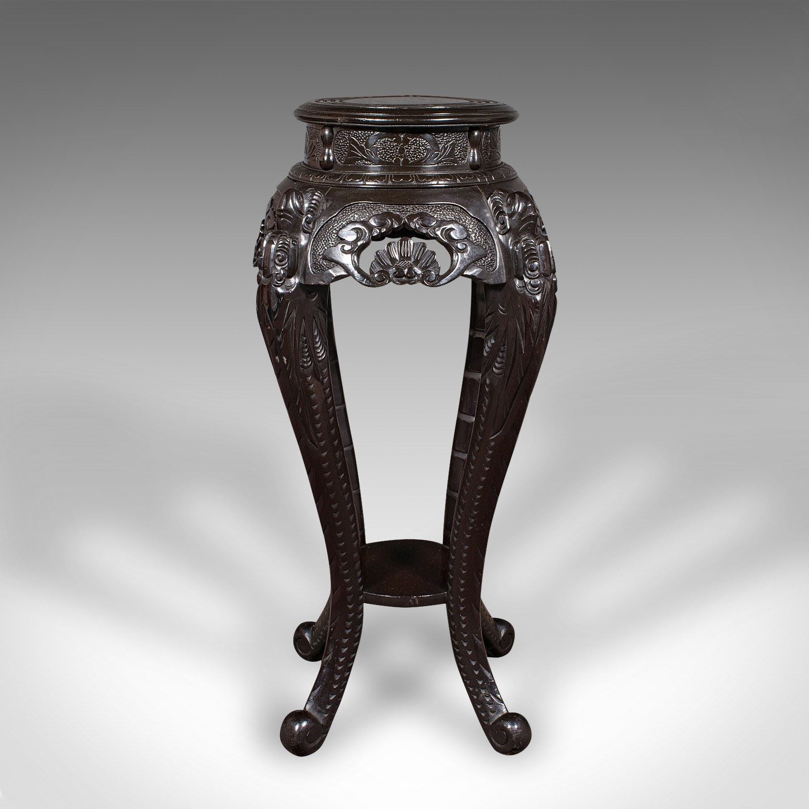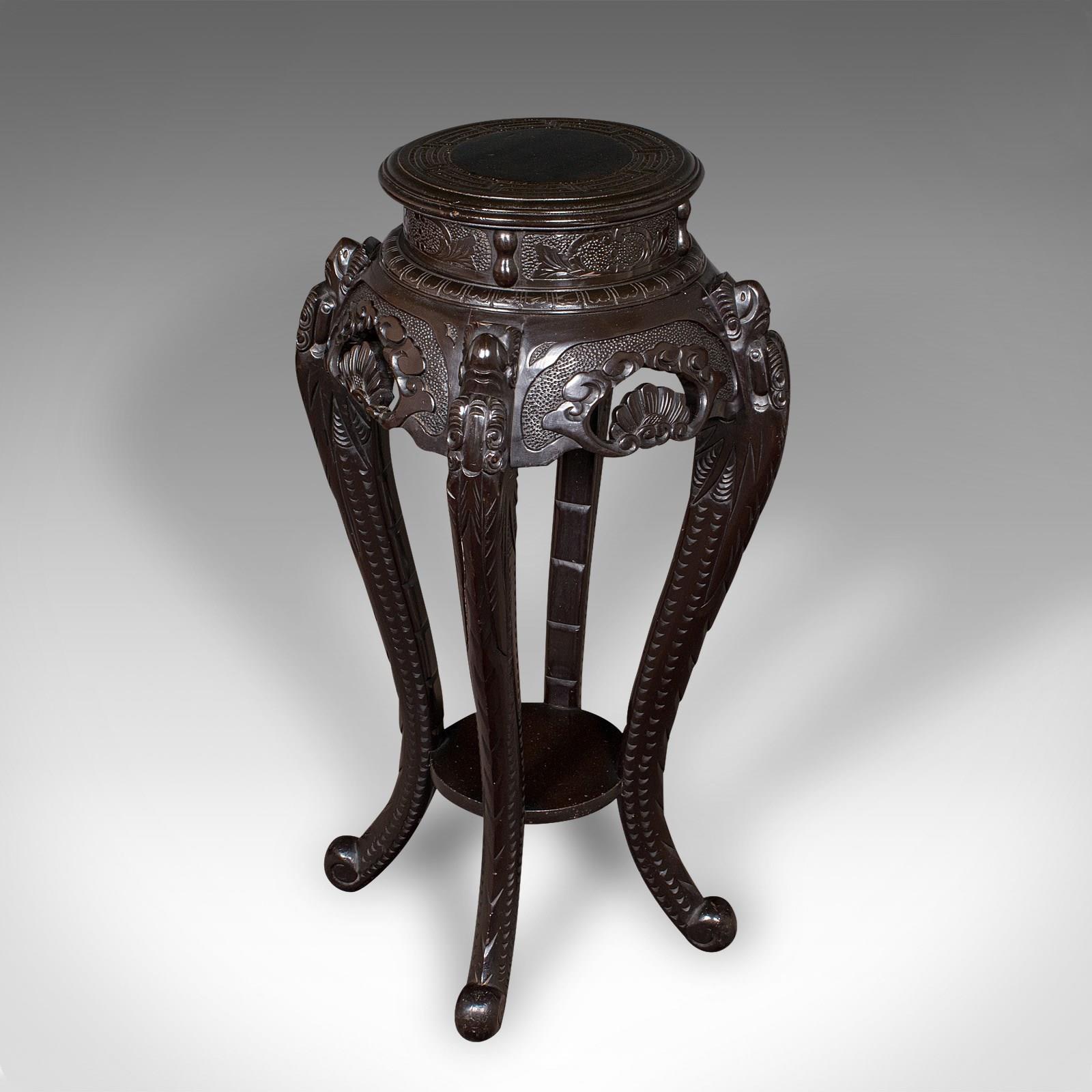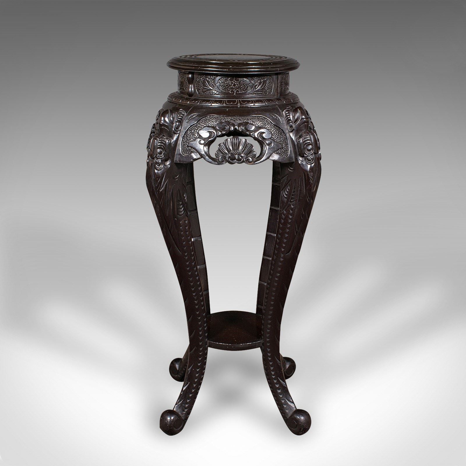This is an antique jardiniere stand. A Japanese, ebonised mahogany portico planter or lamp table, dating to the Victorian period, circa 1880. Of elegant proportion and refined Oriental influence, this decorative piece offers superb display potential for indoor greenery or lighting.