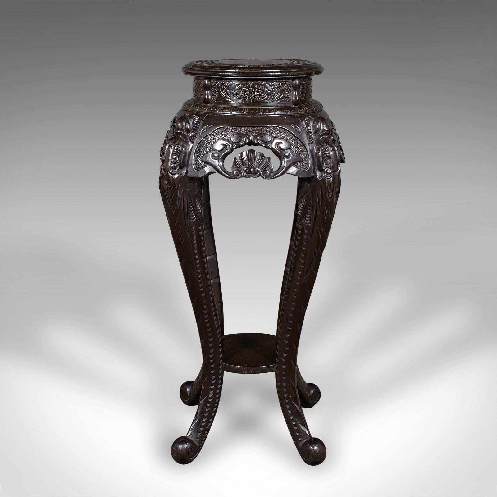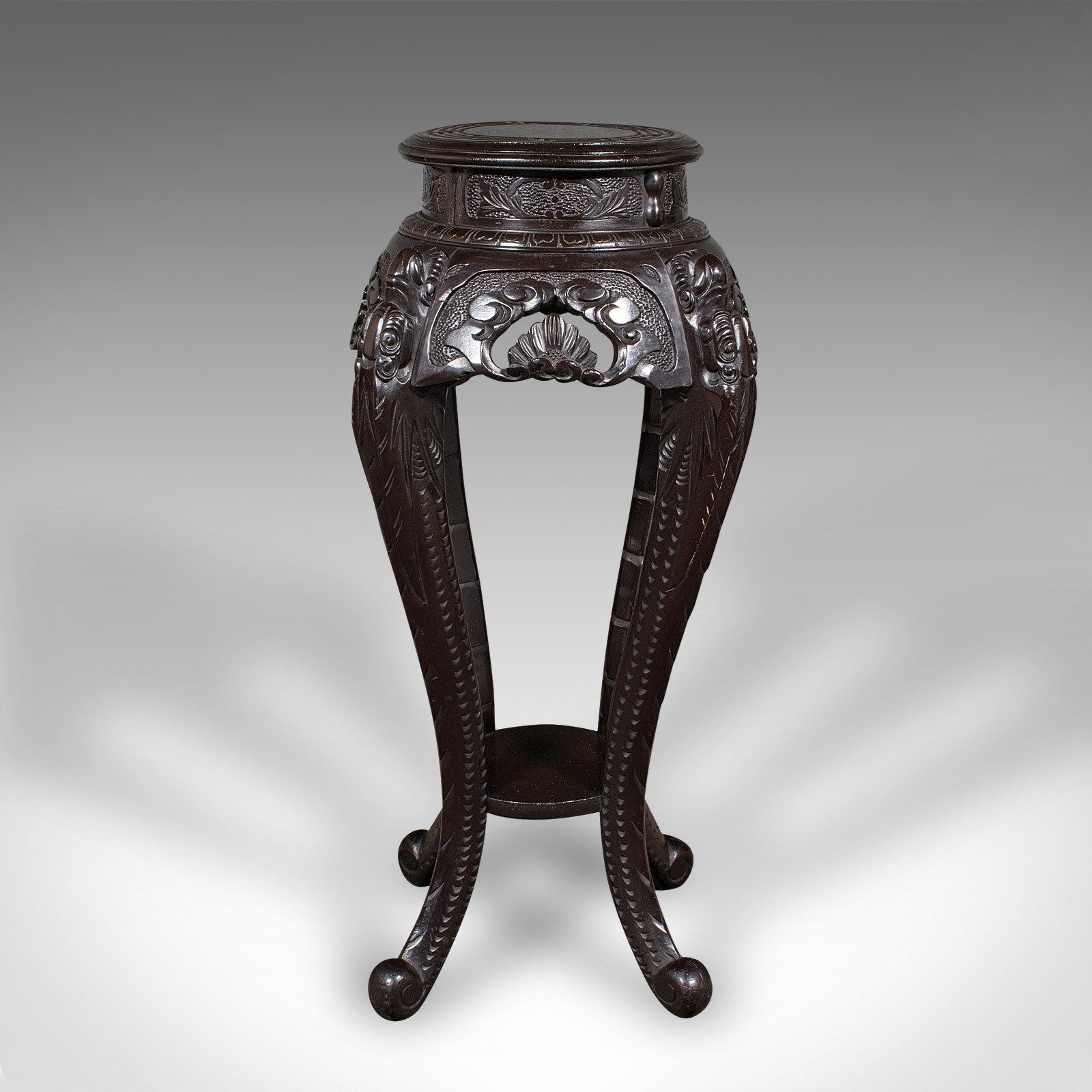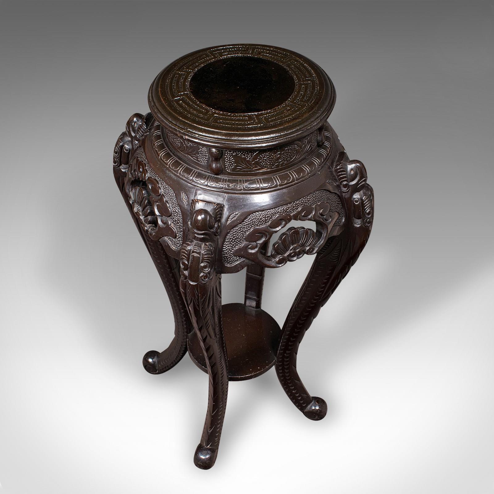 This is an antique jardiniere stand. A Japanese, ebonised mahogany portico planter or lamp table, dating to the Victorian period, circa 1880. Of elegant proportion and refined Oriental influence, this decorative piece offers superb display potential for indoor greenery or lighting.