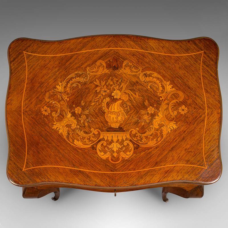 This is an antique jewellery table. A French, walnut and boxwood side or work table, dating to the late Victorian period, circa 1890.