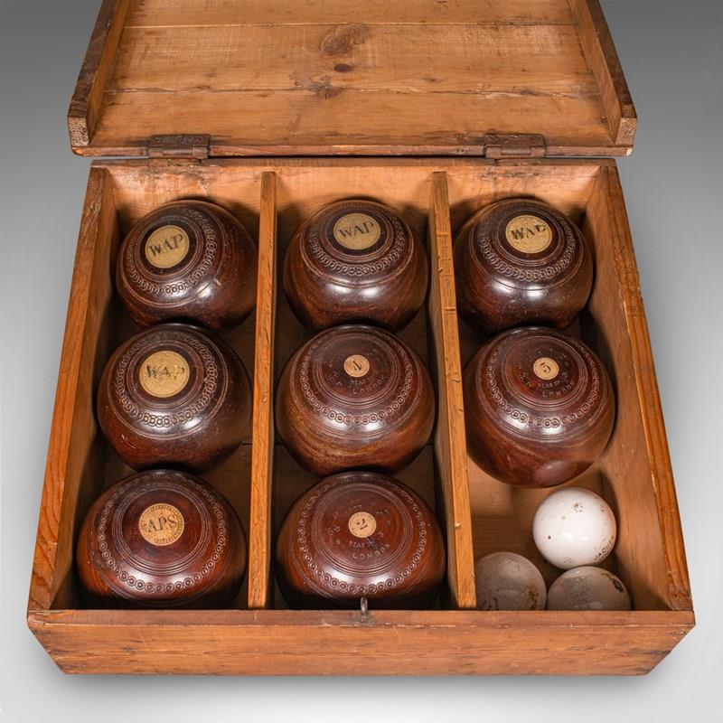 This antique Edwardian lawn bowls set makes a wonderful display piece, and remains a functional reminder of early 20th century leisure and sporting tradition. Ideal for fun in the garden, no matter how uneven the surface. Delivered ready to enjoy.