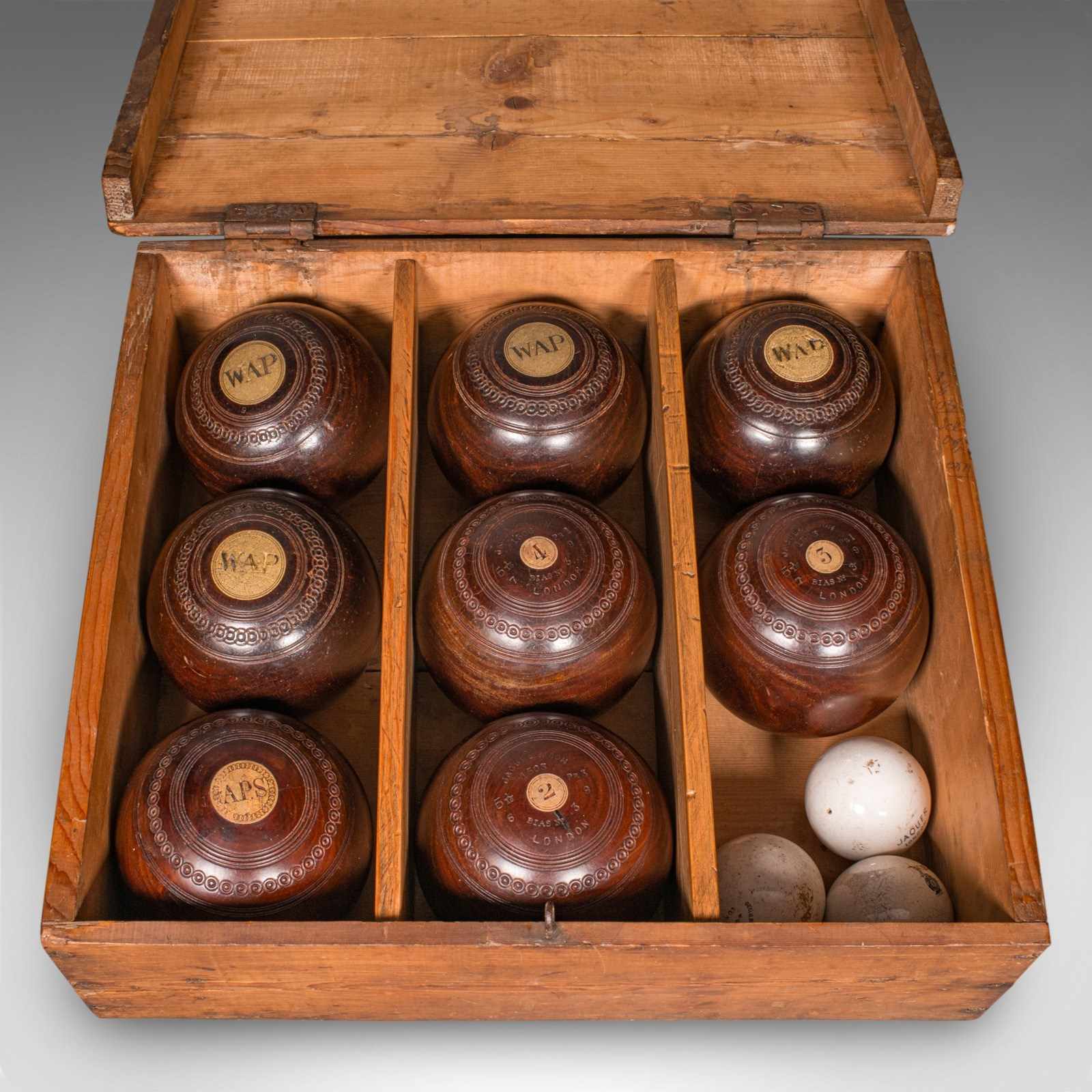This is an antique lawn bowls set. An English, case of bias woods with a trio of ceramic Jacks, dating to the Edwardian period, circa 1910. A superb sporting set, full of character and ideal for a garden party or period games collection.