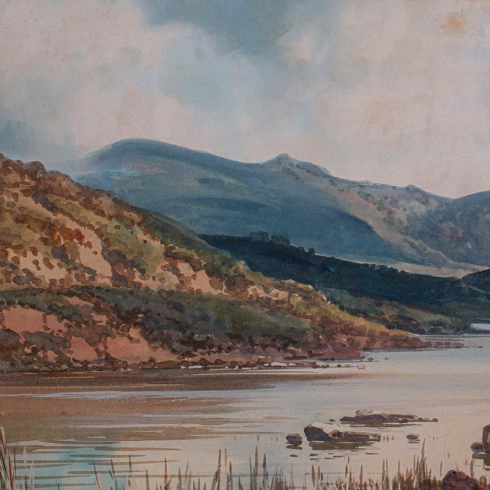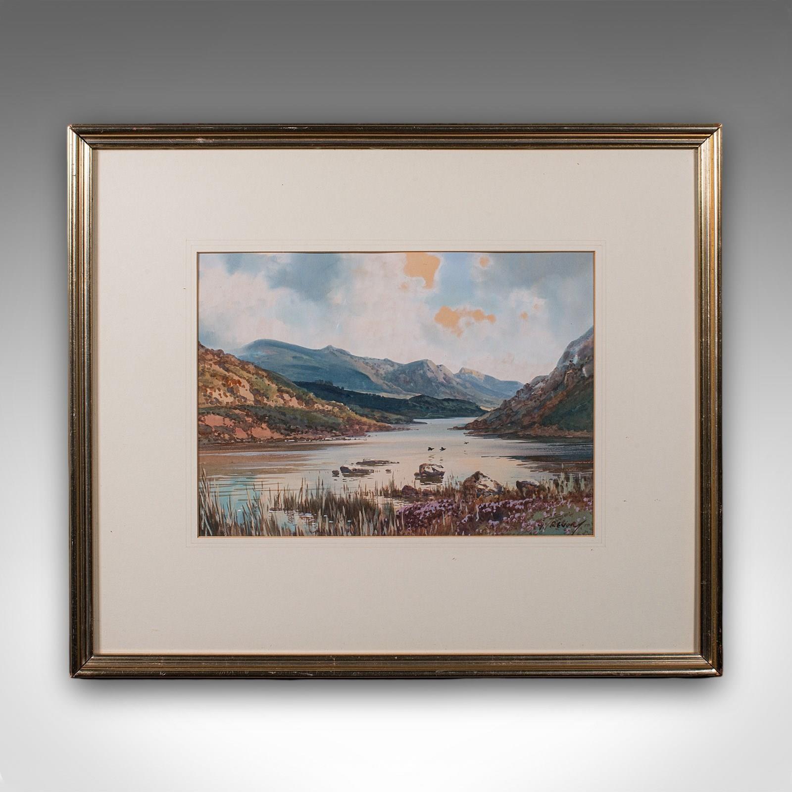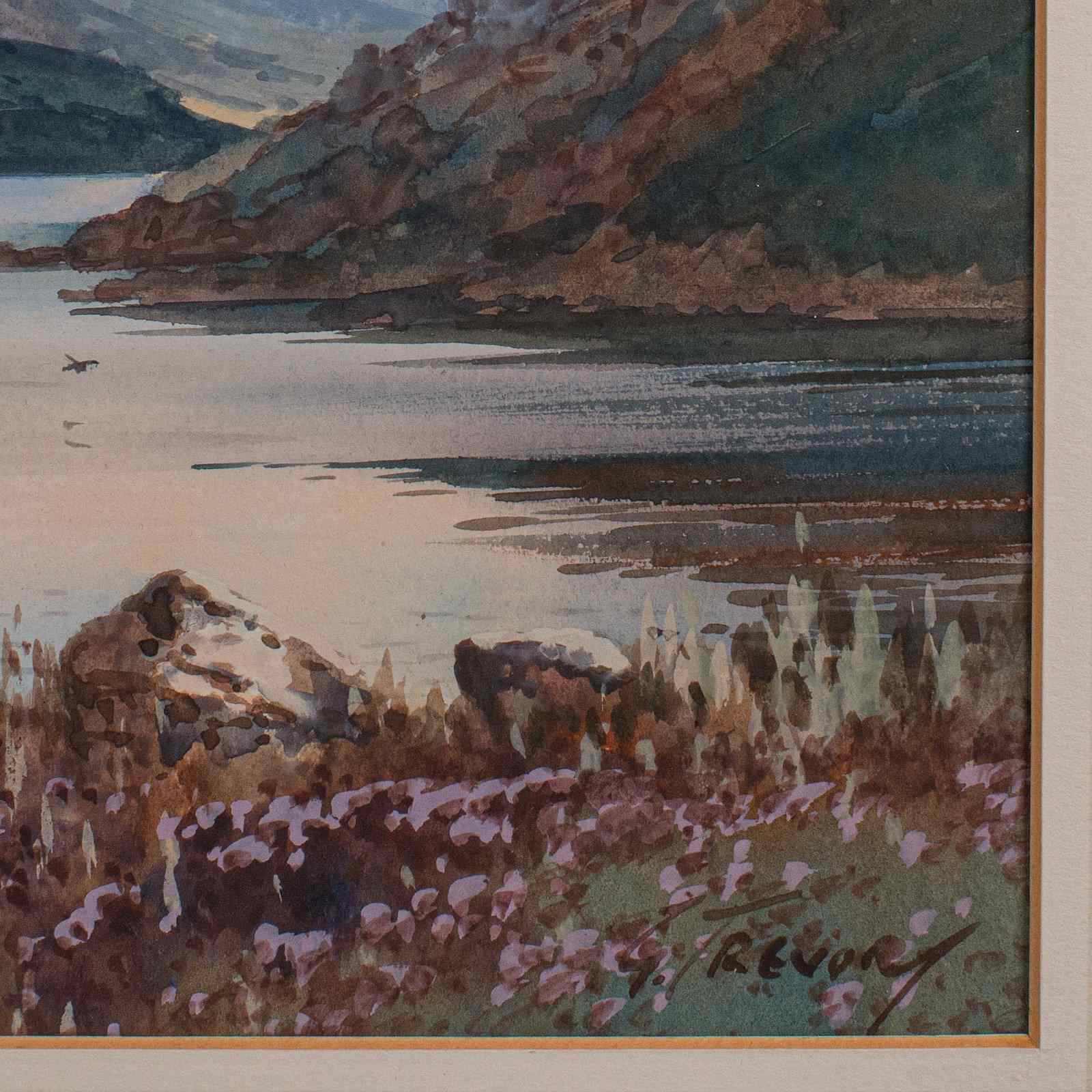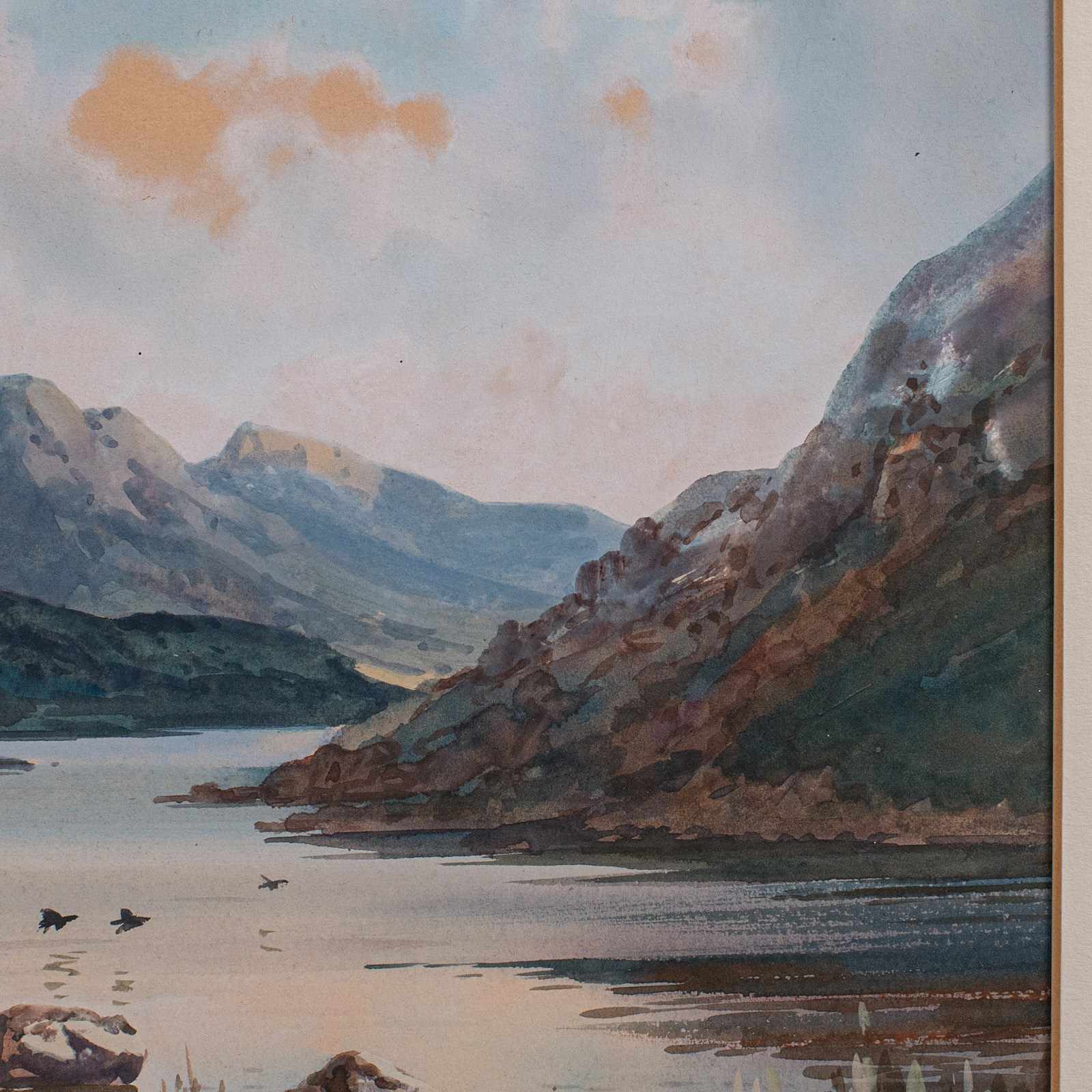 This is an antique Loch landscape painting. A Scottish, framed watercolour, dating to the early 20th century, circa 1920. An appealing Highland study, rich in atmosphere and regional character.