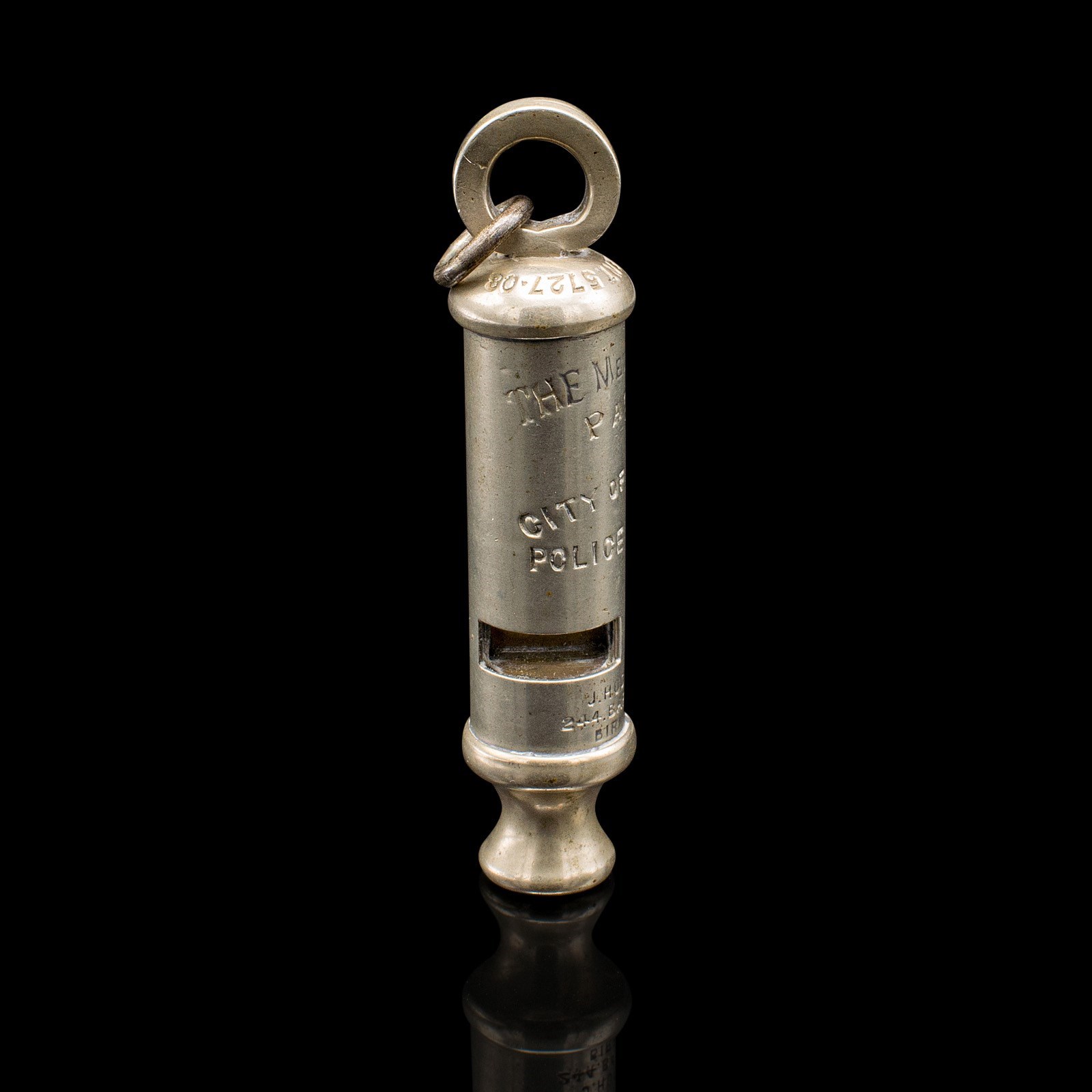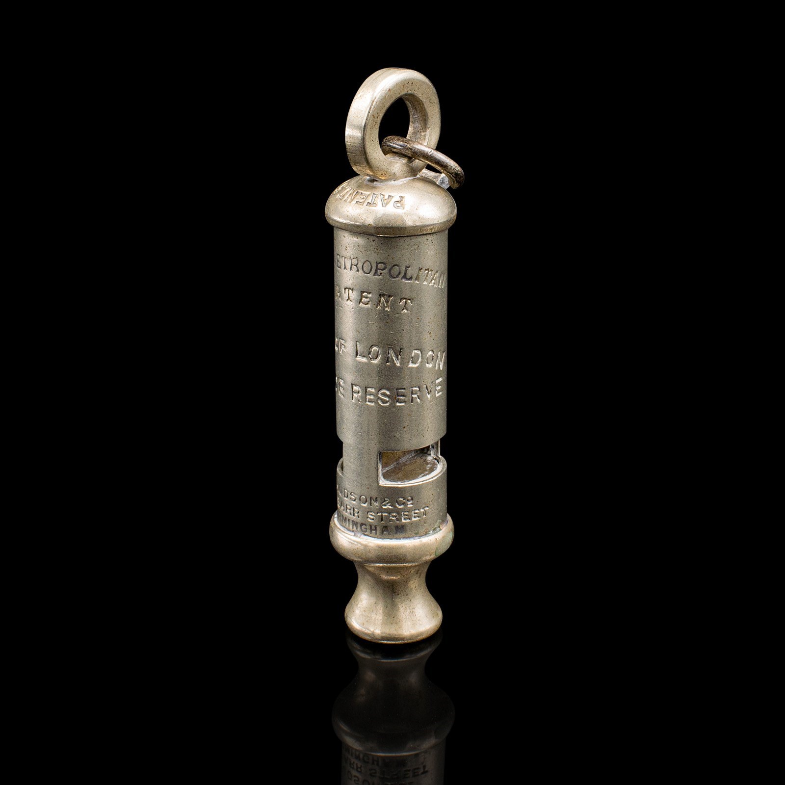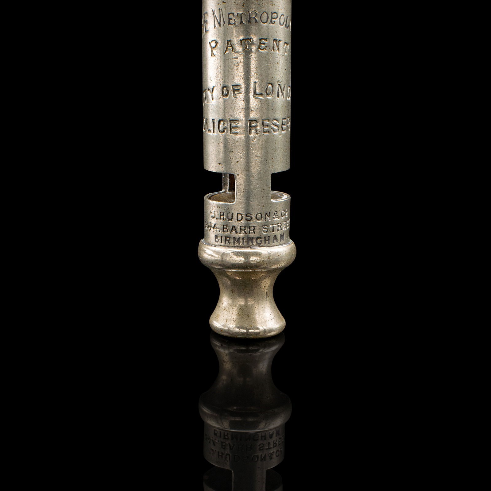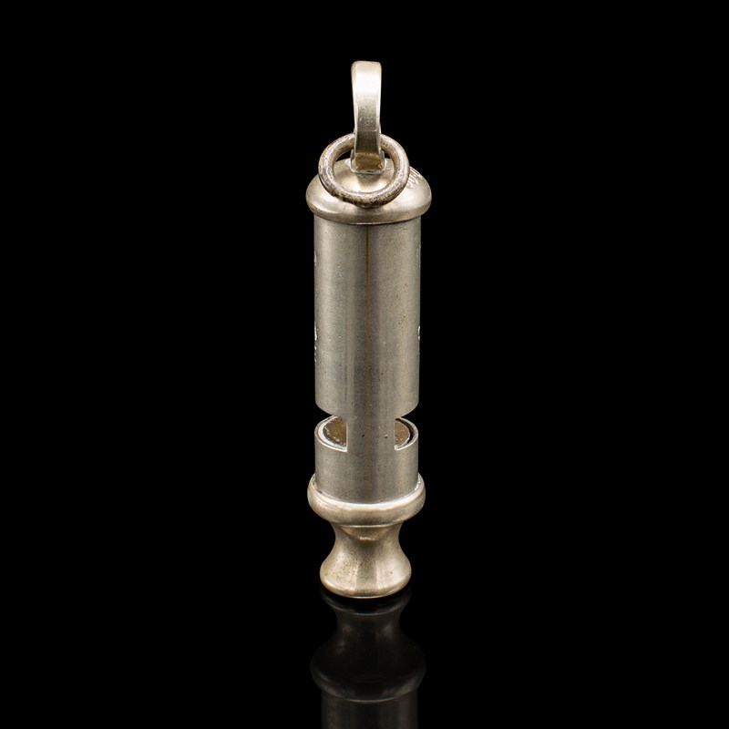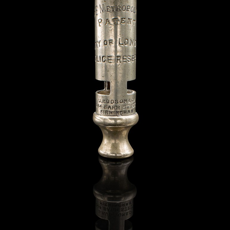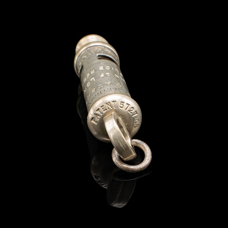 This is an antique London police whistle. An English, silvered brass patented whistle by J Hudson and Co of Birmingham, dating to the early 20th century, circa 1920.