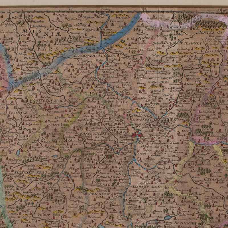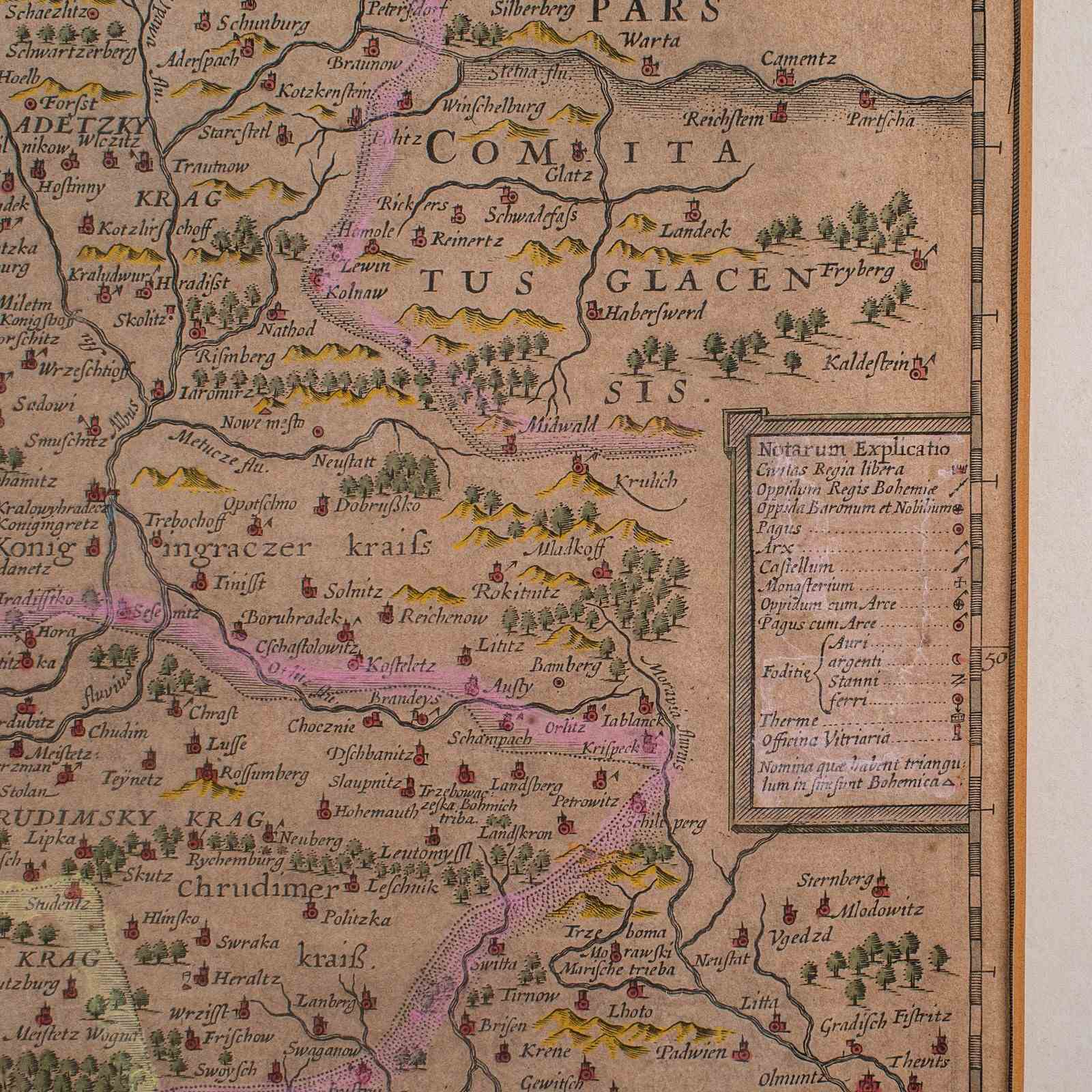 This is an antique map of Bohemia. A Dutch, framed atlas engraving of modern day Germany, Austria and the Czech Republic by Johannes Janssonius, dating to the 17th century and later, circa 1630.