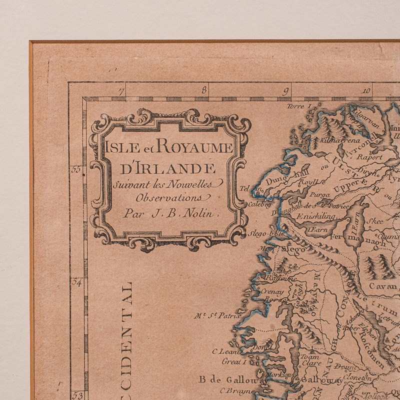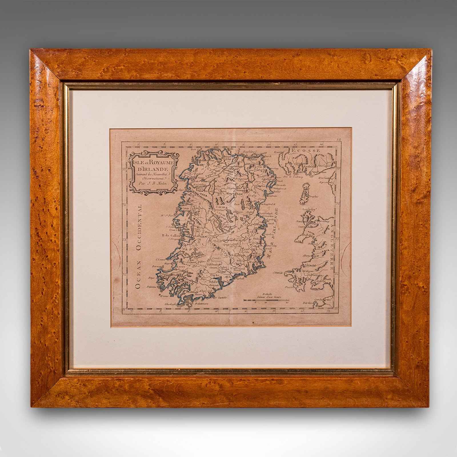 This is an antique map of Ireland. A French, maple framed cartography engraving by Jean-Baptiste Nolin, this posthumous atlas edition dating to the Georgian period, circa 1780.