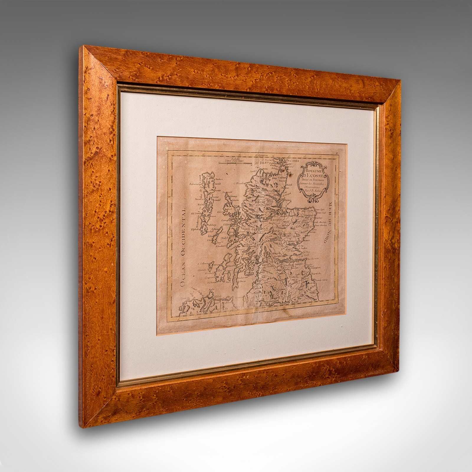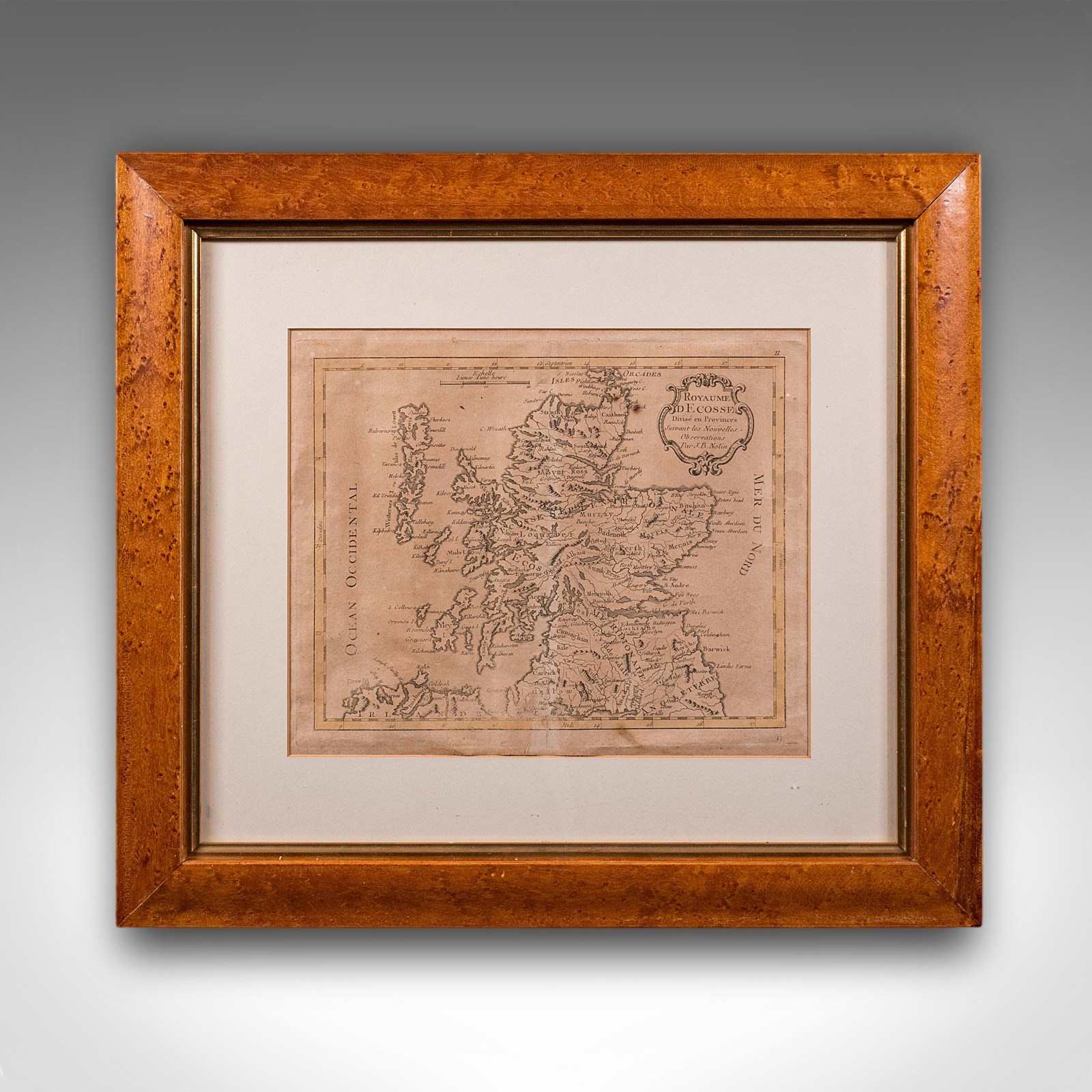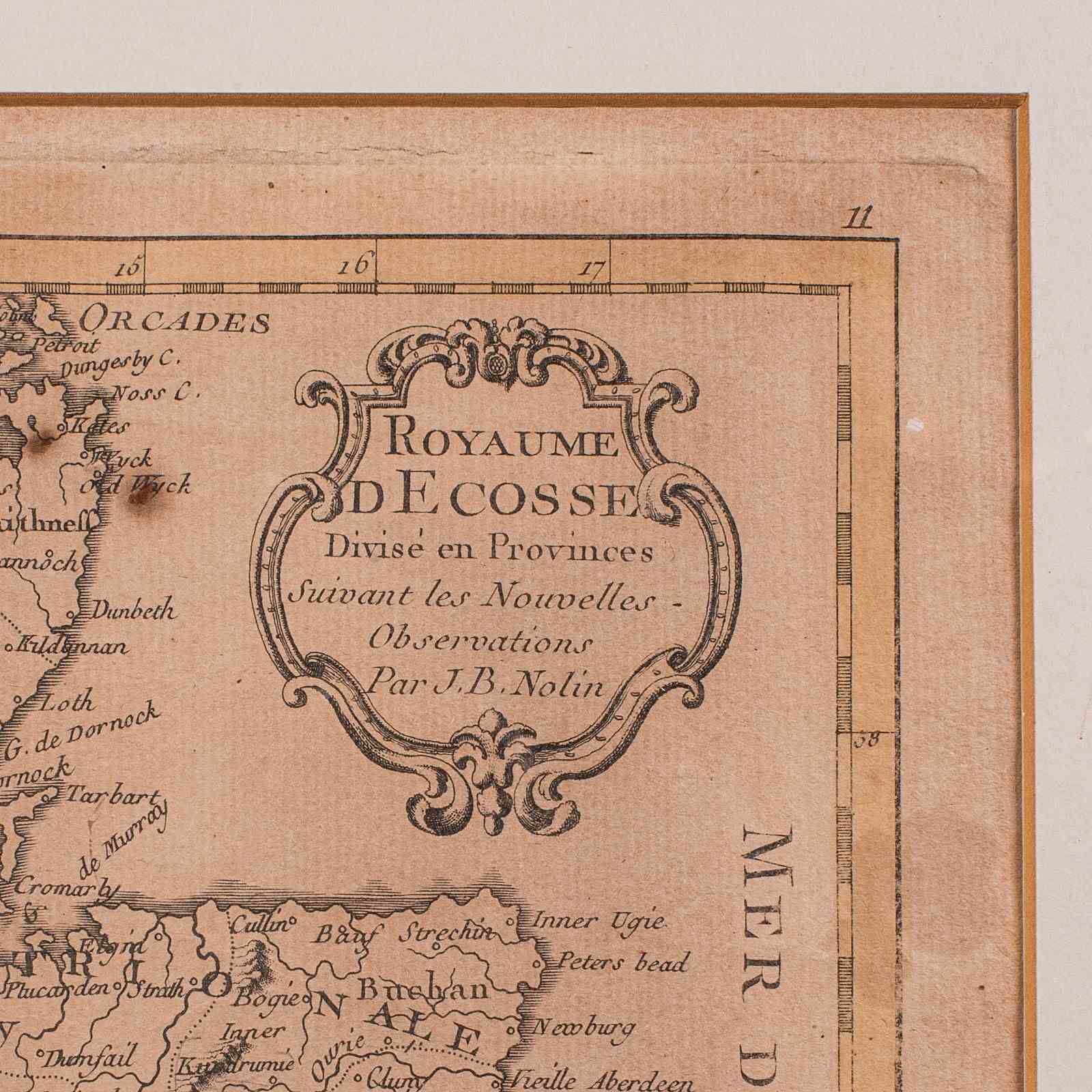 This is an antique map of Scotland. A French, maple framed cartography engraving by Jean-Baptiste Nolin, this posthumous atlas edition dating to the Georgian period, circa 1780.