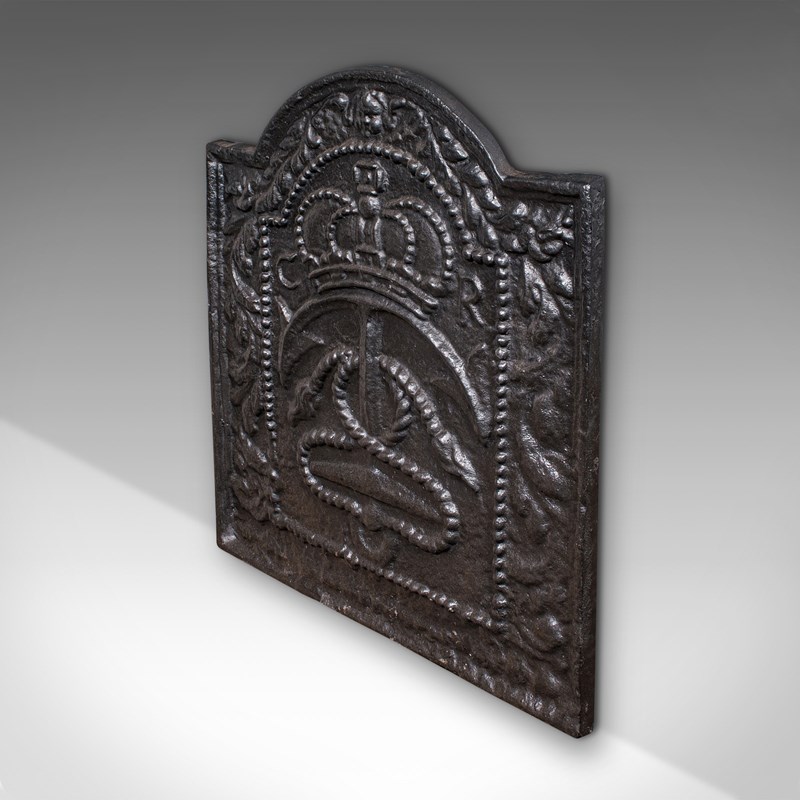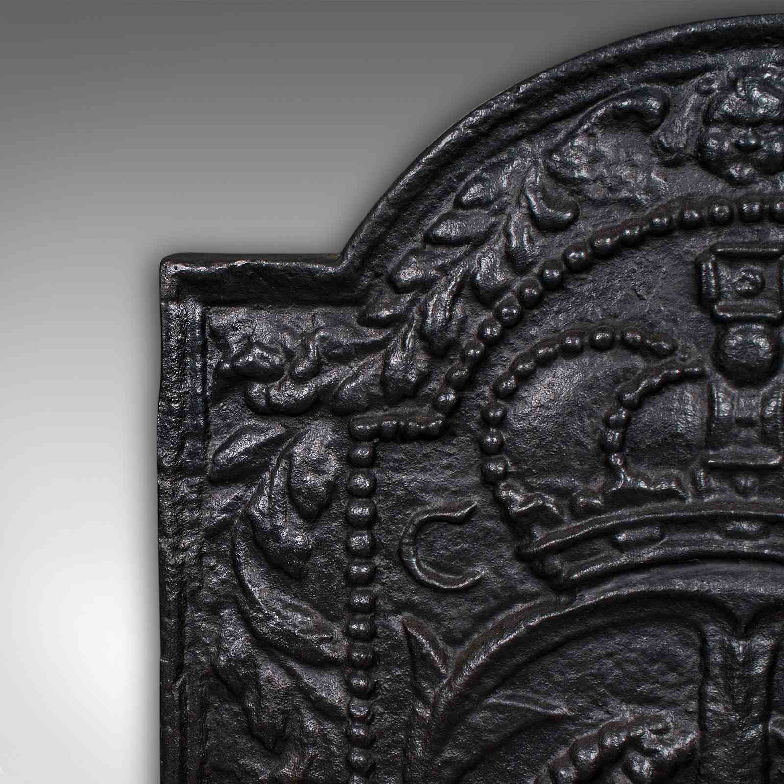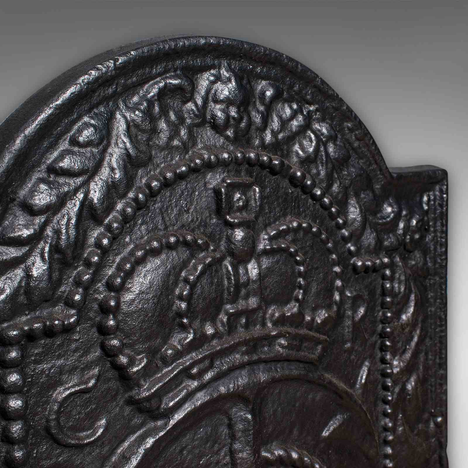This is an antique maritime fire back, an English cast iron fireplace reflector in Carolean taste, dating to the early Victorian period, circa 1850. An attractive fireside piece with strong nautical and historical appeal.