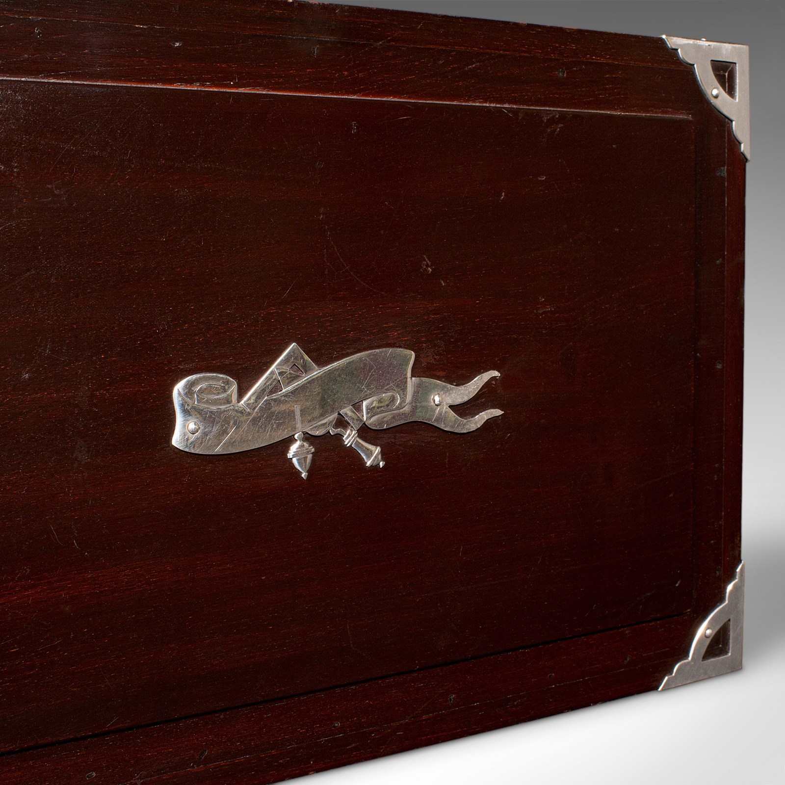 Fascinating, unmarked plaque to the lid, with a mitre square, trowel and plumb bob motif