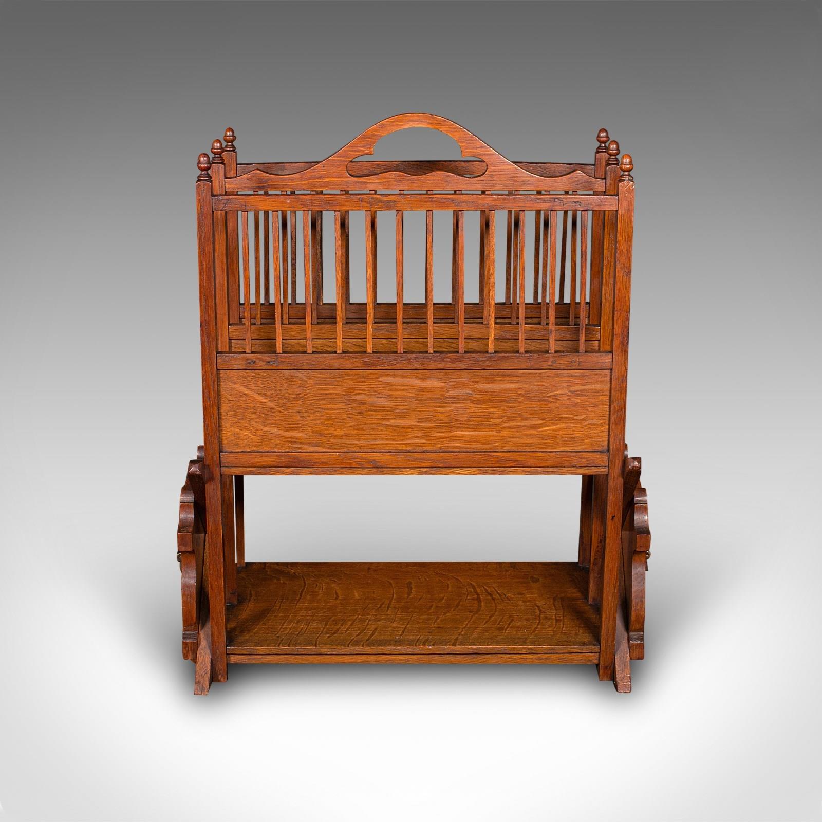 This is an antique metamorphic Canterbury stand, an English oak magazine rack with extending book slides, dating to the Edwardian period, circa 1910.