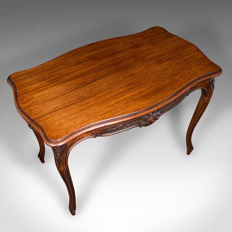 This is a superb antique occasional table. A French, mahogany centre table or desk, dating to the early Victorian period, circa 1850. Boasting an elegant form, exquisite carved detail, and fine grain interest — ideal as a central feature or a characterful writing table.