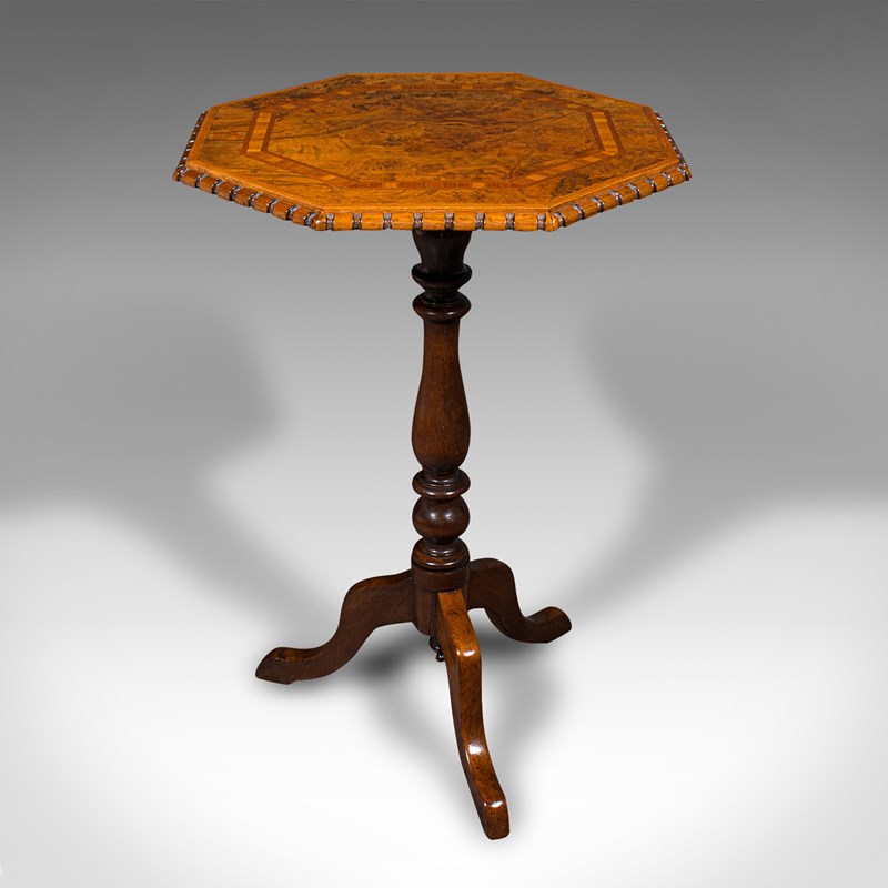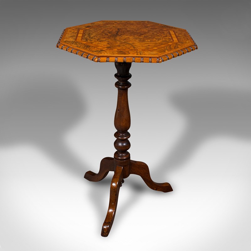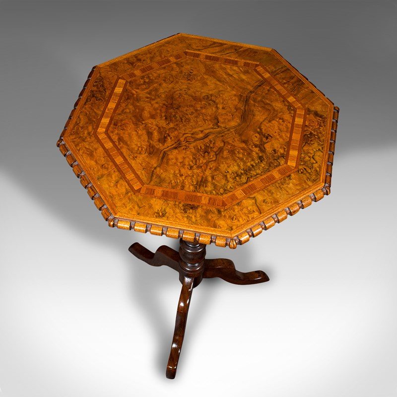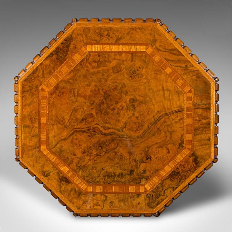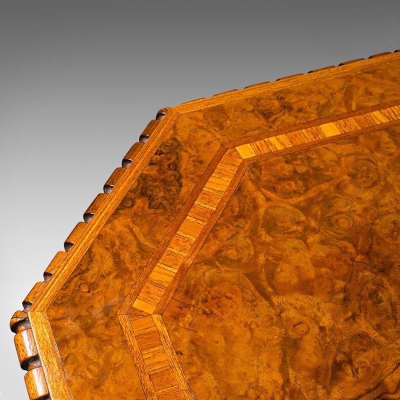Antique Octagonal Wine Table, English, Burr Walnut, Lamp, Occasional, Victorian