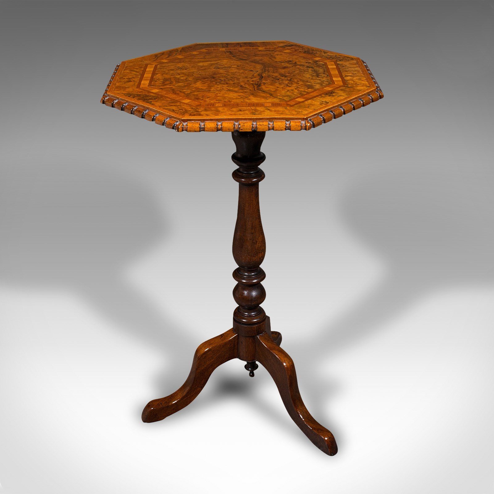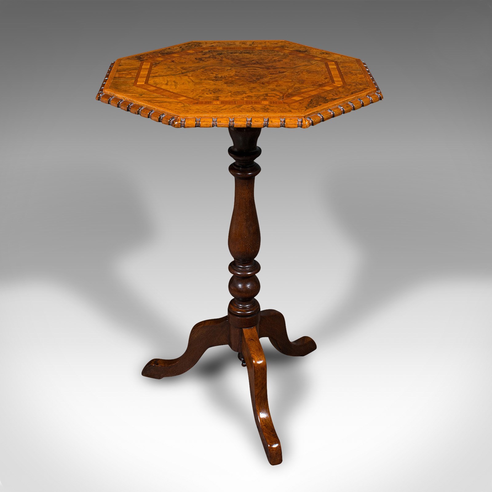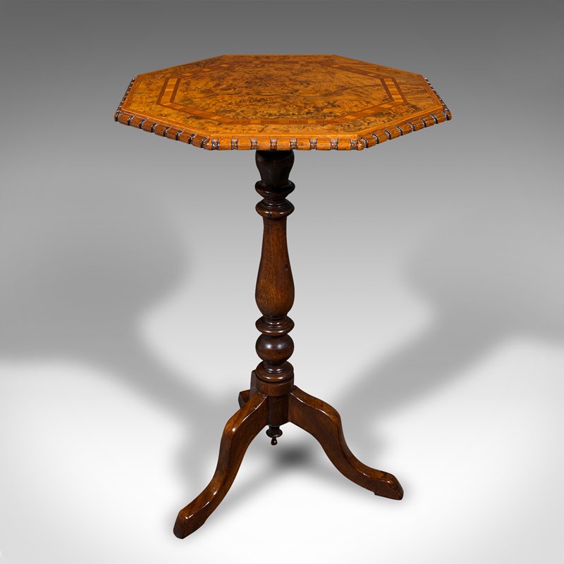 Antique Octagonal Wine Table, English, Burr Walnut, Lamp, Occasional, Victorian