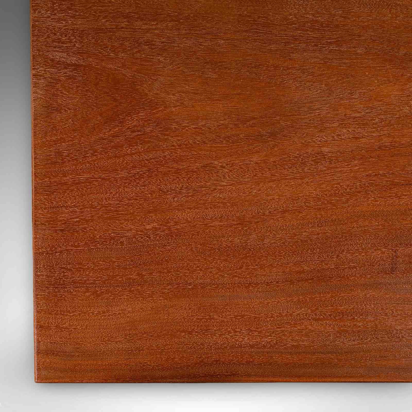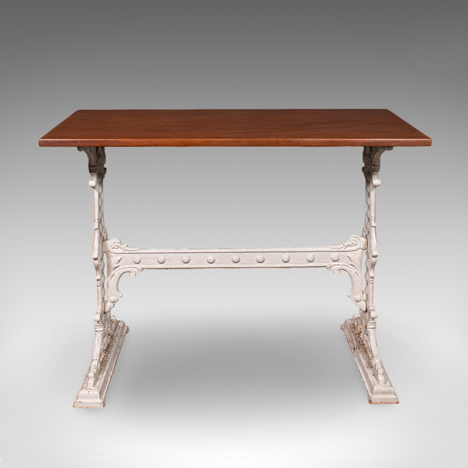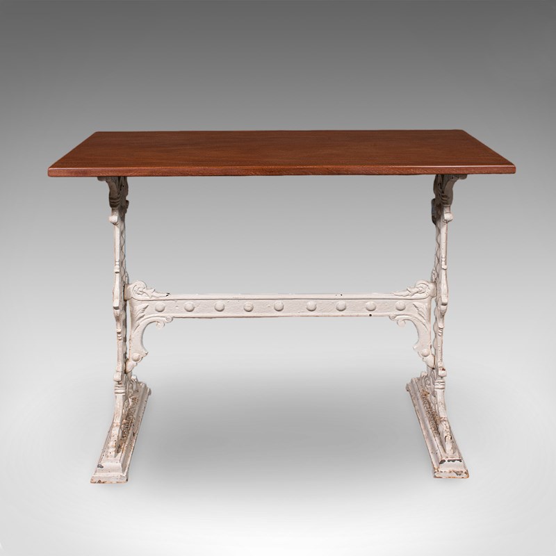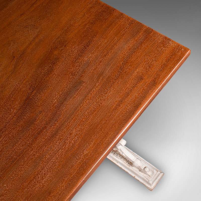 This is an antique orangery planting table. An English, mahogany and cast iron portico or serving table, dating to the late Victorian period, circa 1900.
