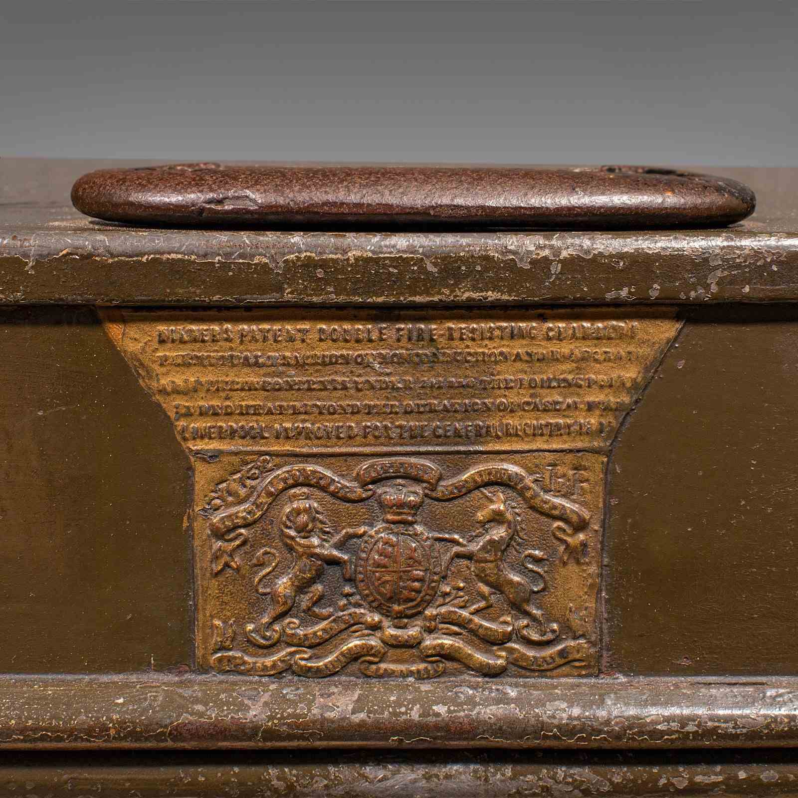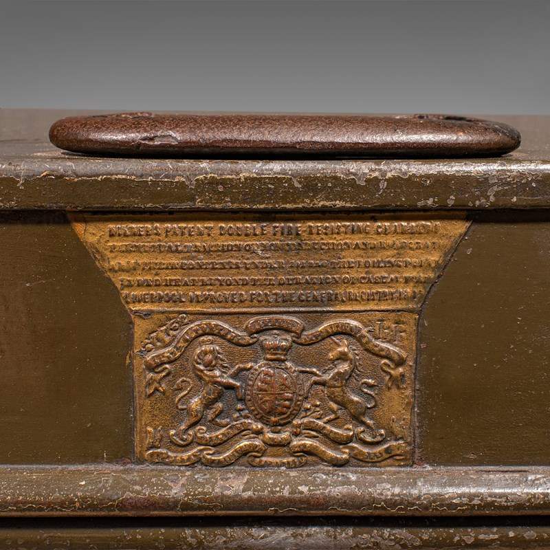 This is a heavy antique Patent fireproof safe. An English, cast iron lock box by Milners of Liverpool, dating to the Victorian period, circa 1870.
