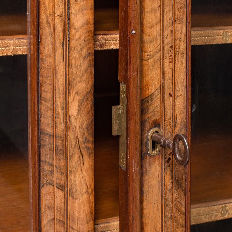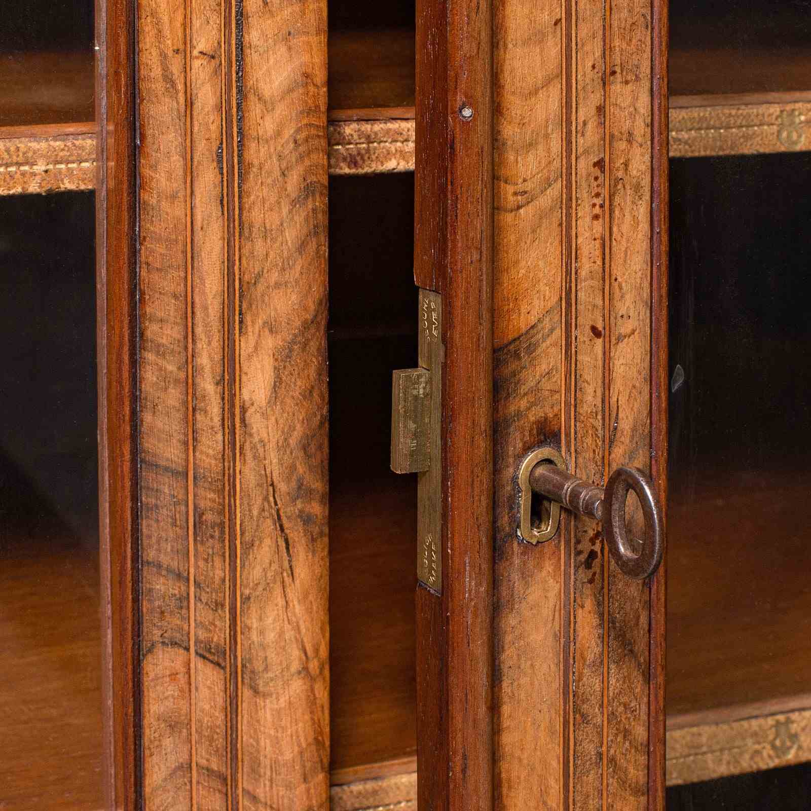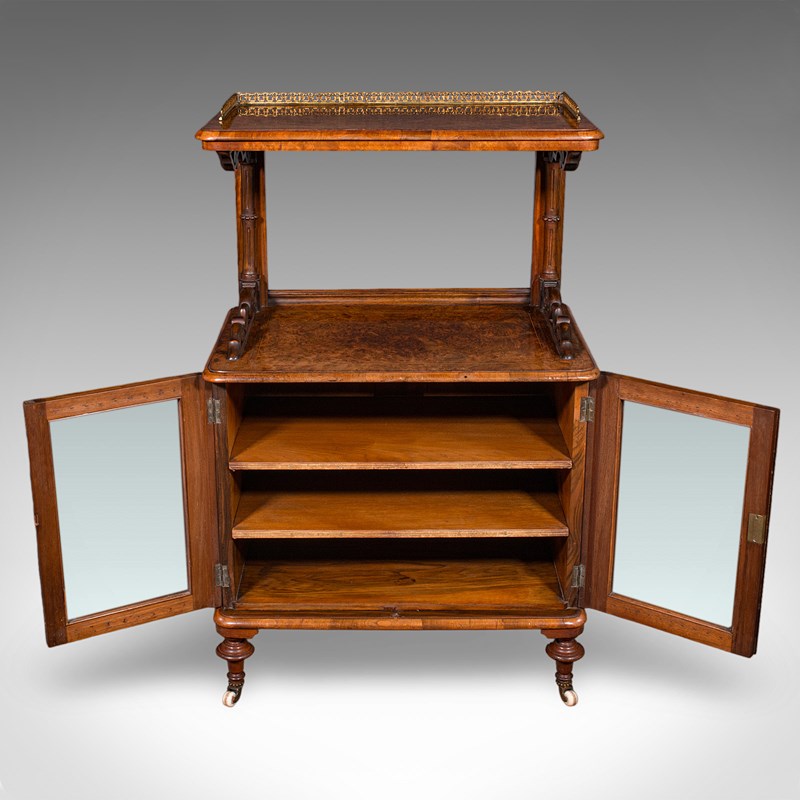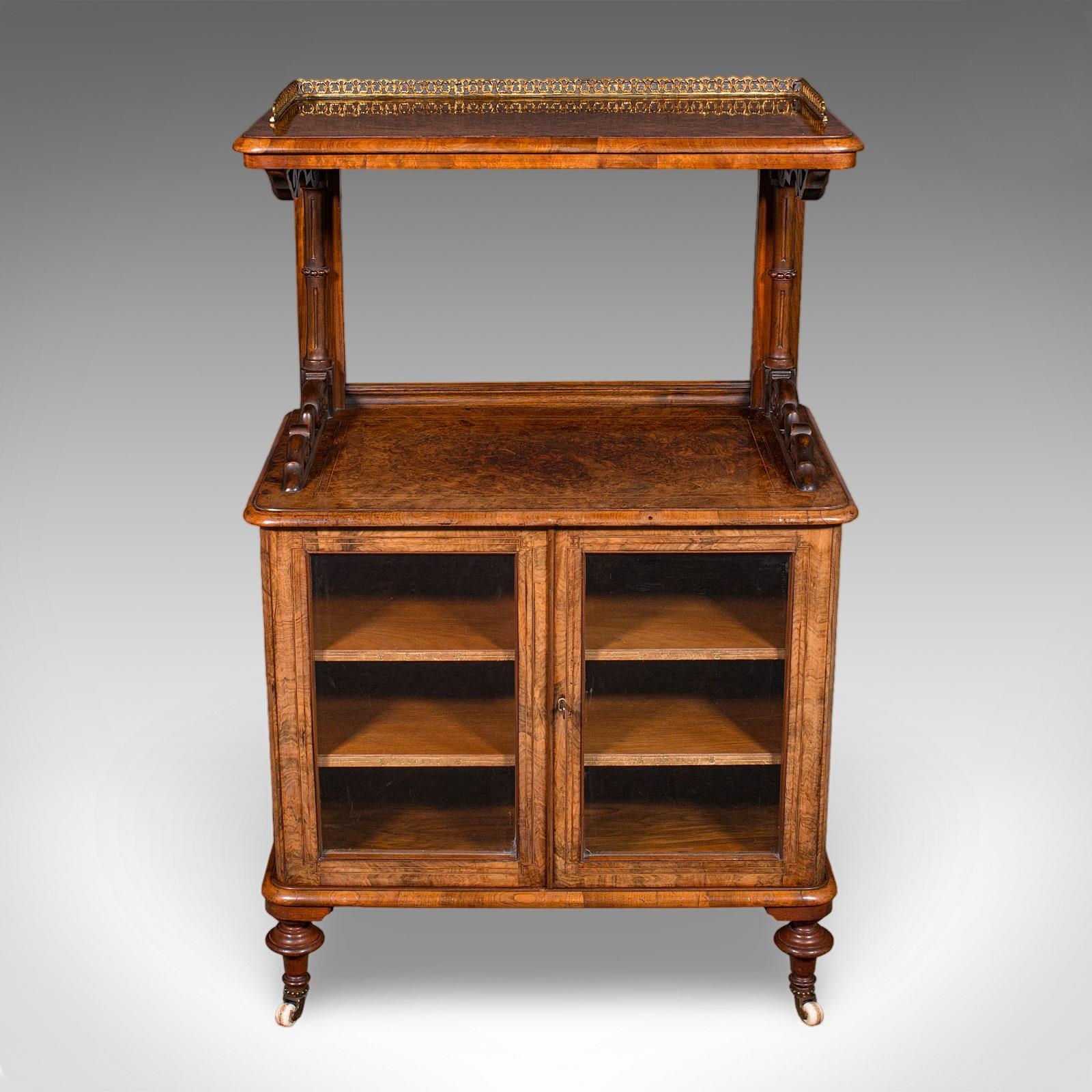 This is an antique pianist’s lounge server. An English, burr walnut display cabinet with buffet form, dating to the early Victorian period, circa 1850. A striking piece of cabinetry with exceptional figuring, refined proportion and superb decorative presence.
