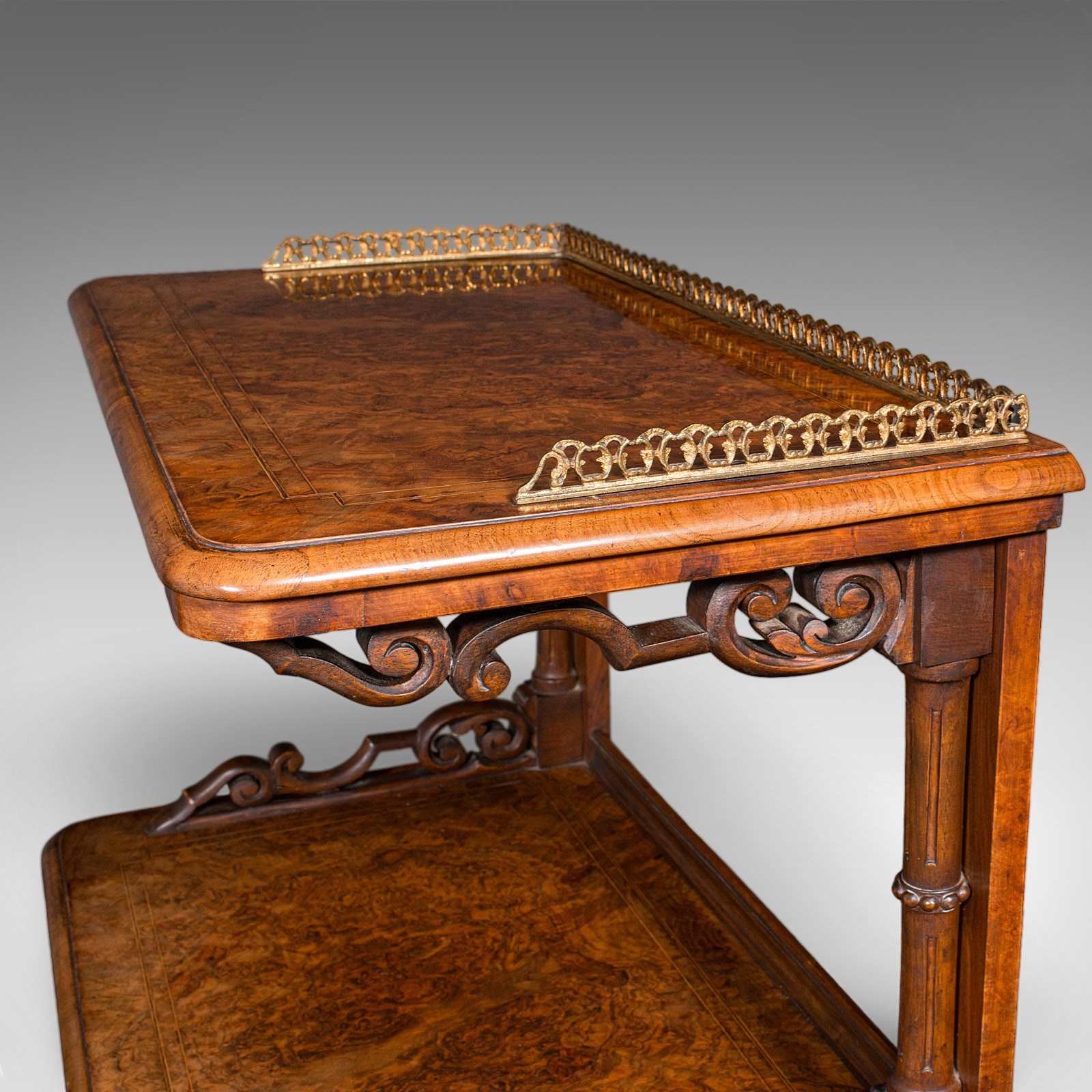 A distinguished and visually arresting Victorian burr walnut server, ideal for music rooms, elegant lounges or any setting desiring fine period craftsmanship and display utility. Solid joints and construction, delivered ready for the home.