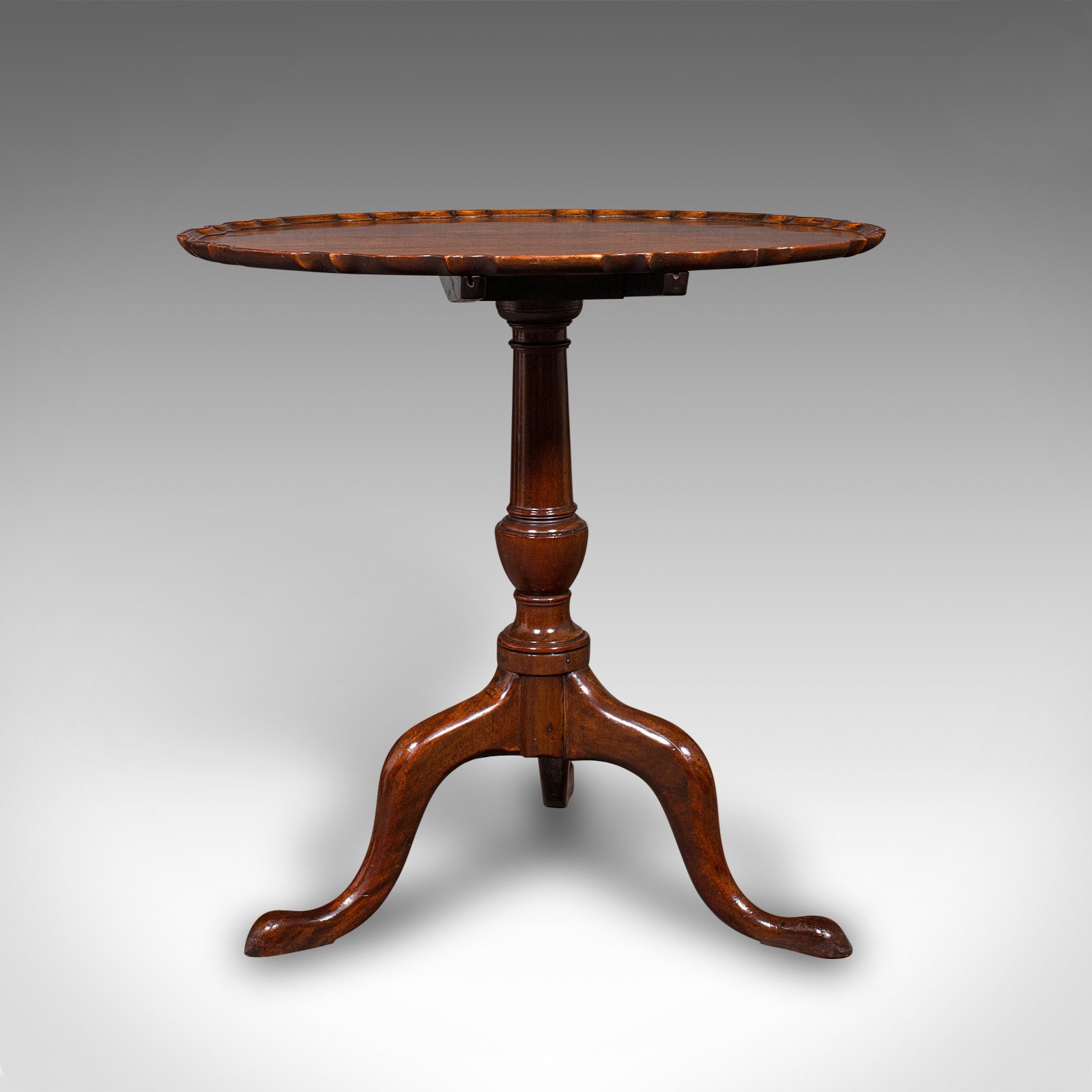 This is an antique pie crust side table. An English, mahogany tilt-top games or occasional table, dating to the Georgian period, circa 1790. A fine example of 18th century craftsmanship, displaying the period-favourite pie crust form and elegant proportions.