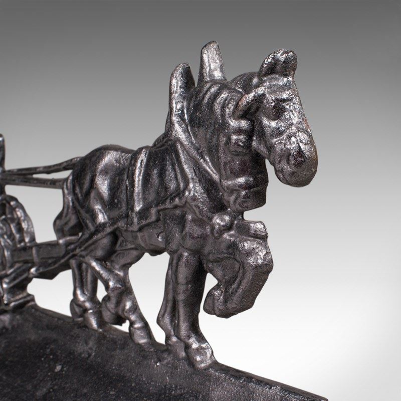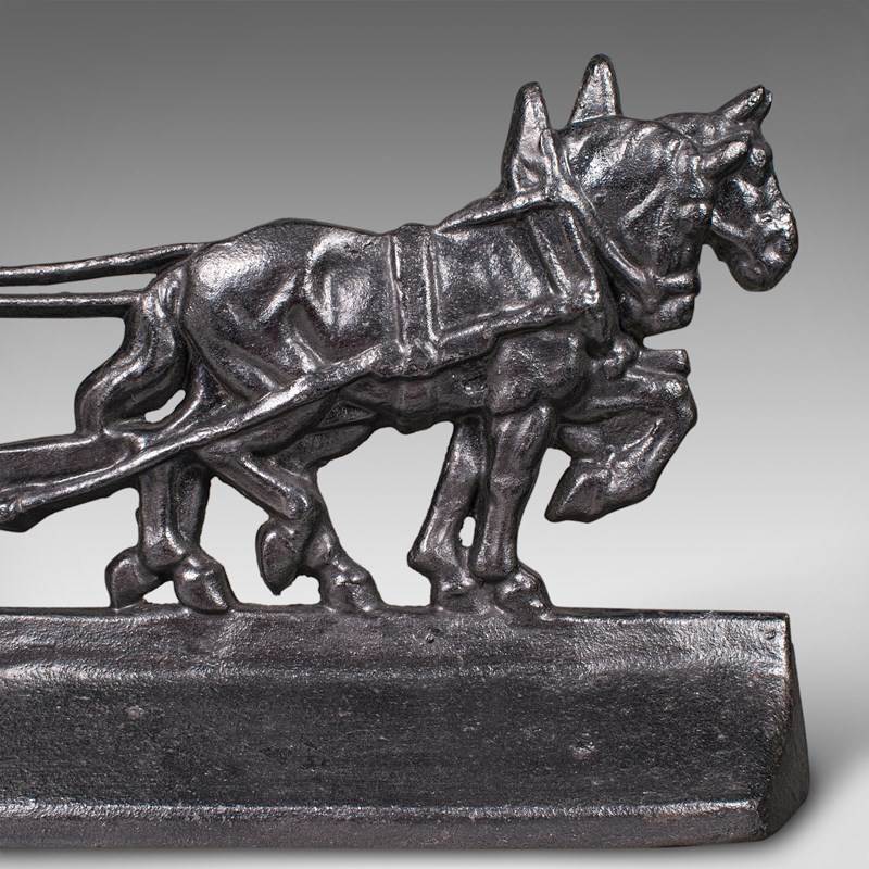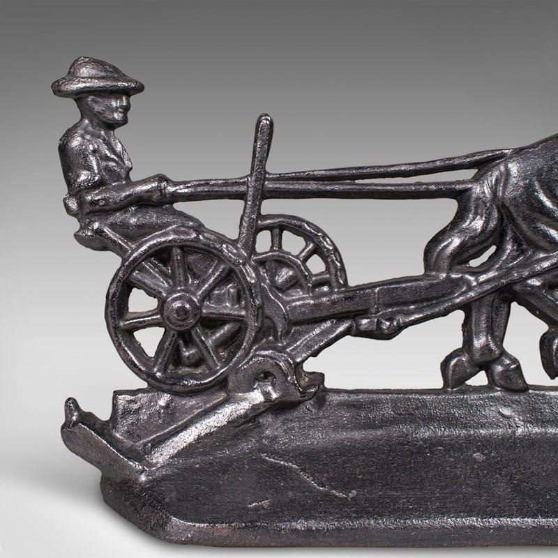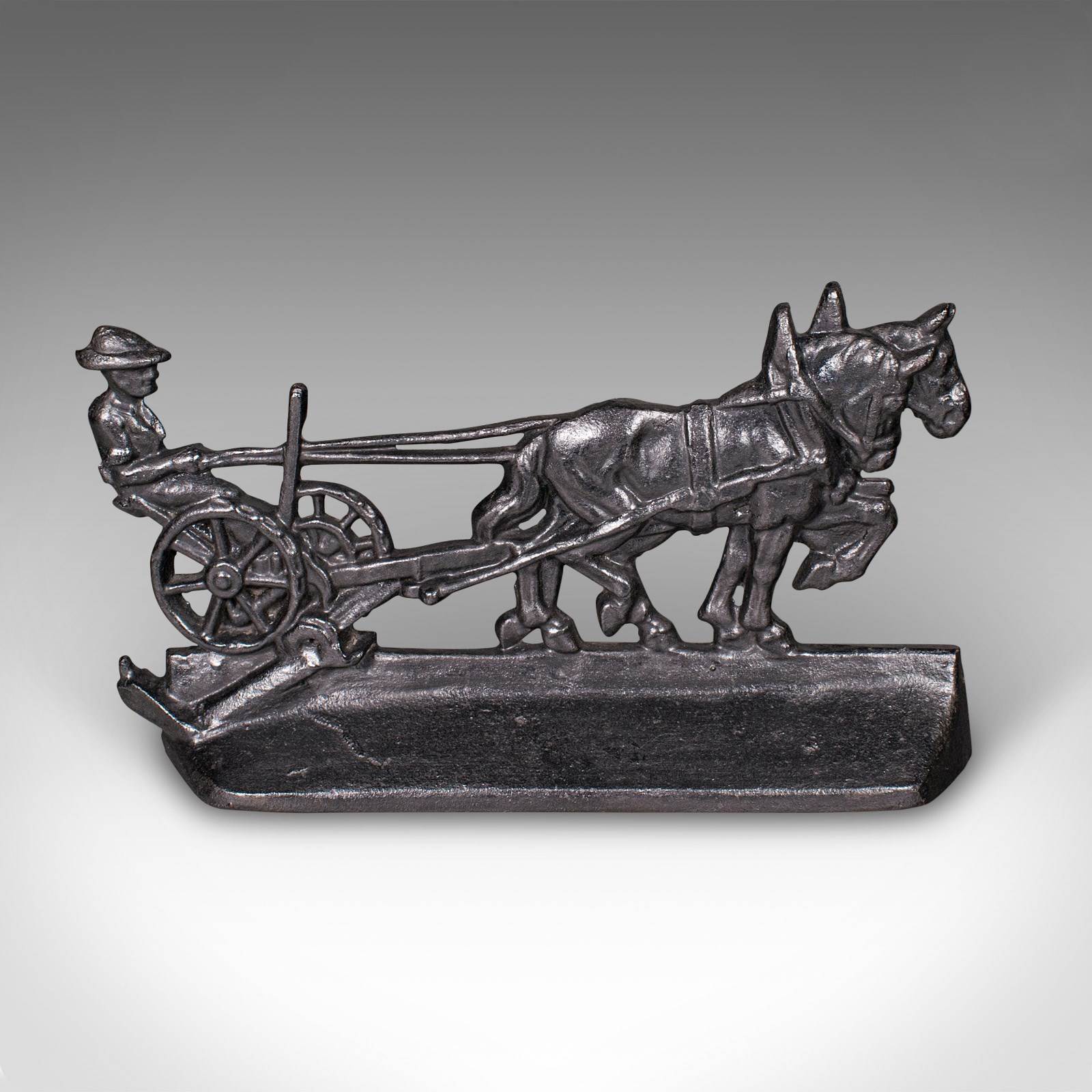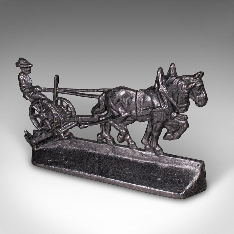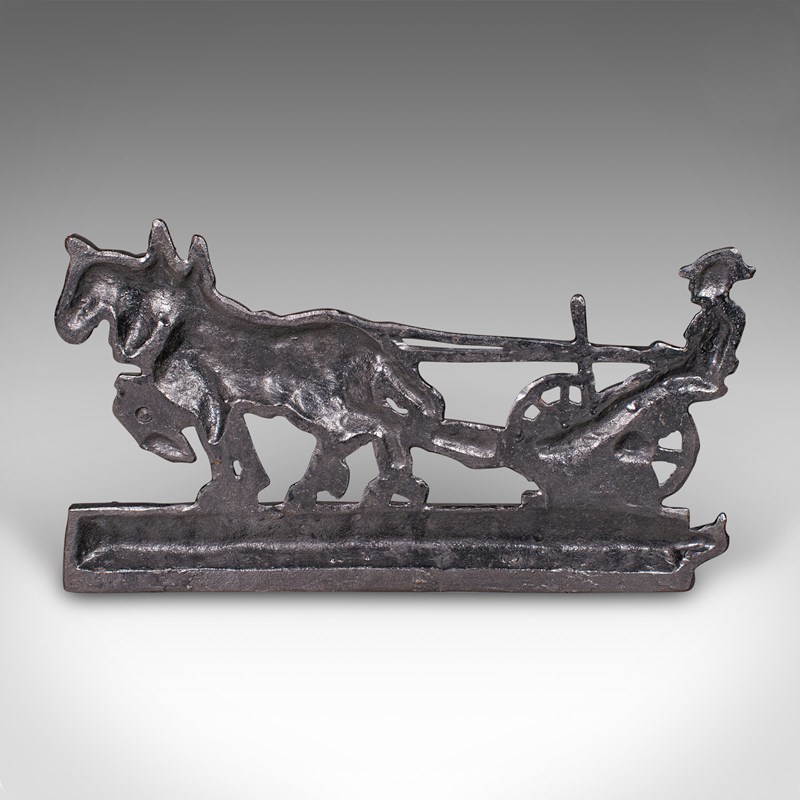 This is an antique Ploughman doorstop. An English, cast iron farmhouse decorative door keeper with Shire horse interest, dating to the early Victorian period, circa 1850. A charming and substantial piece, it captures a delightful rural scene with fine period detail.