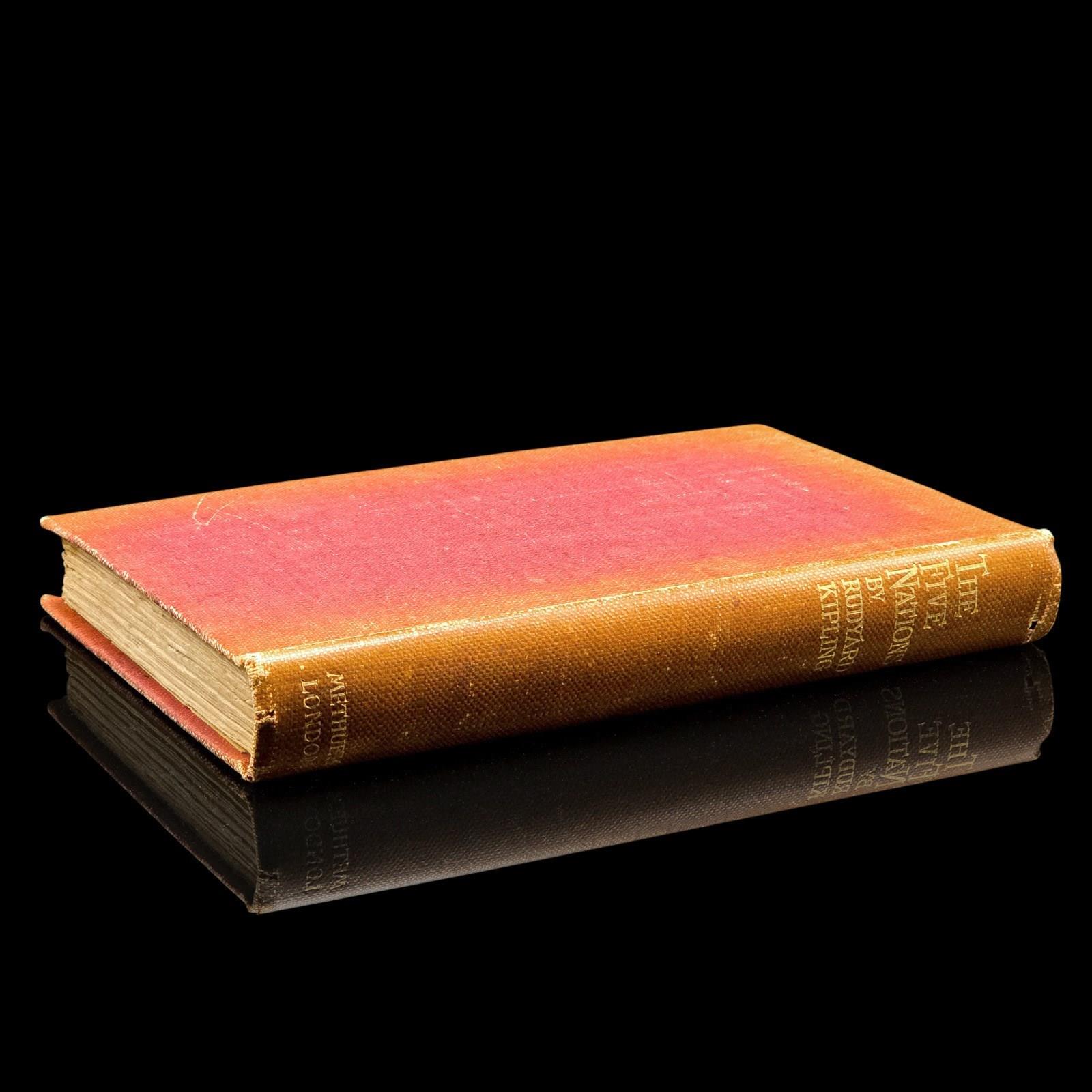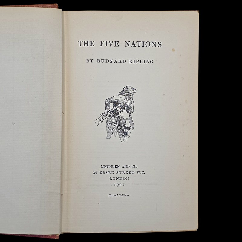 This is an antique copy of The Five Nations by Rudyard Kipling, an evocative bound poetry collection published in 1903. Presented in intact, original order with only light markings, the volume curates fifty poems across 215 pages, with an additional 38-page addenda. A fine example of early 20th century literary publishing, illustrated and handsomely bound.