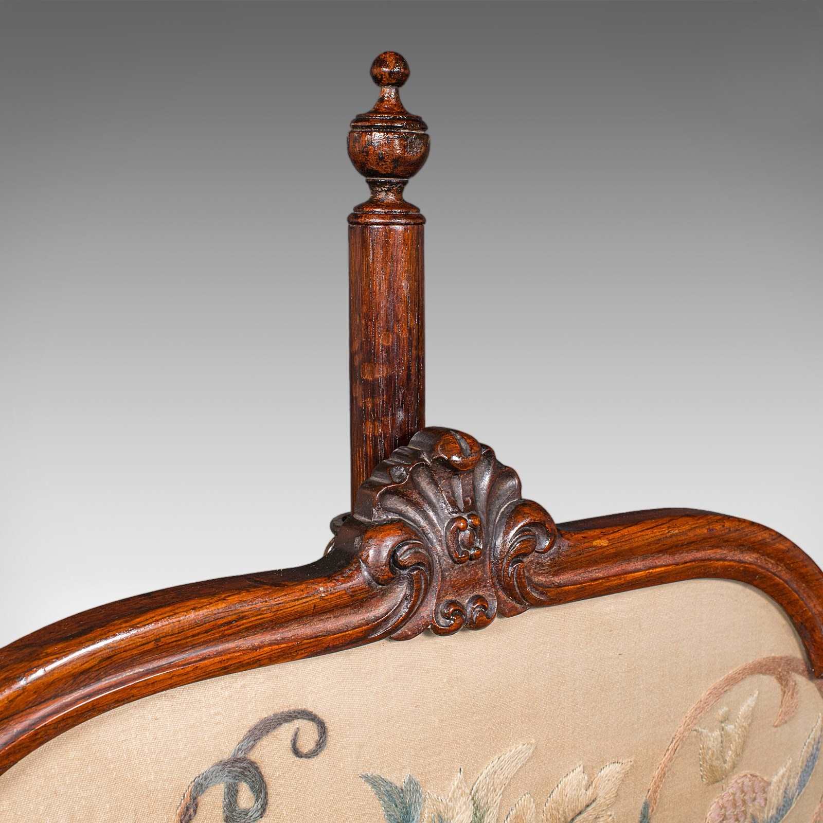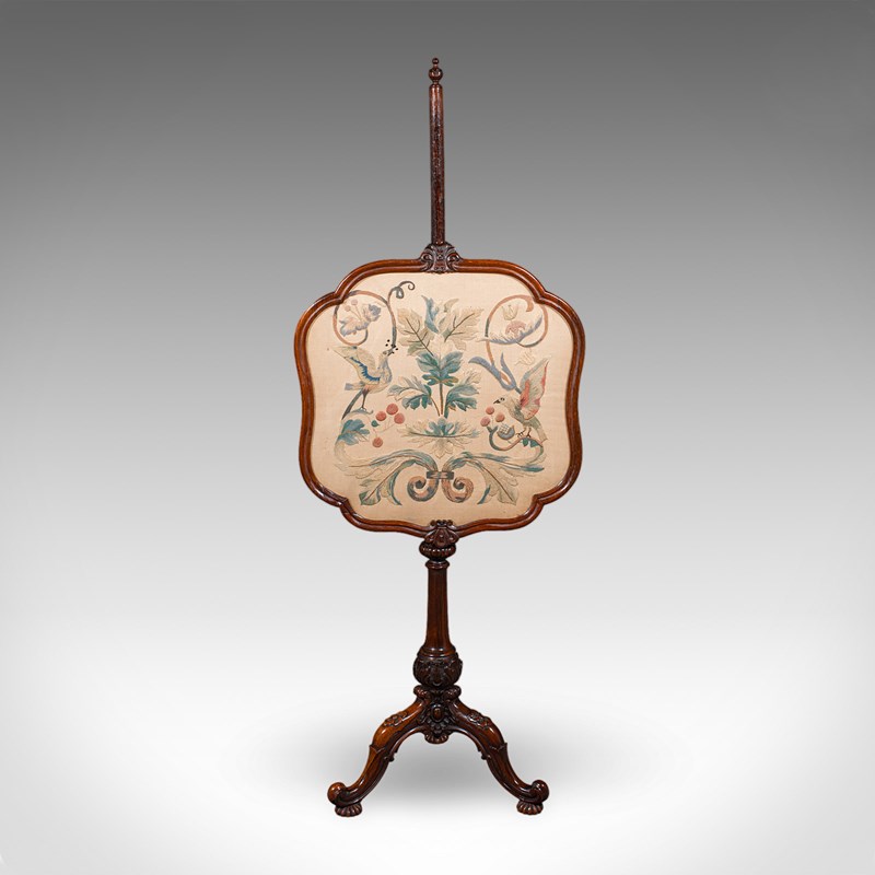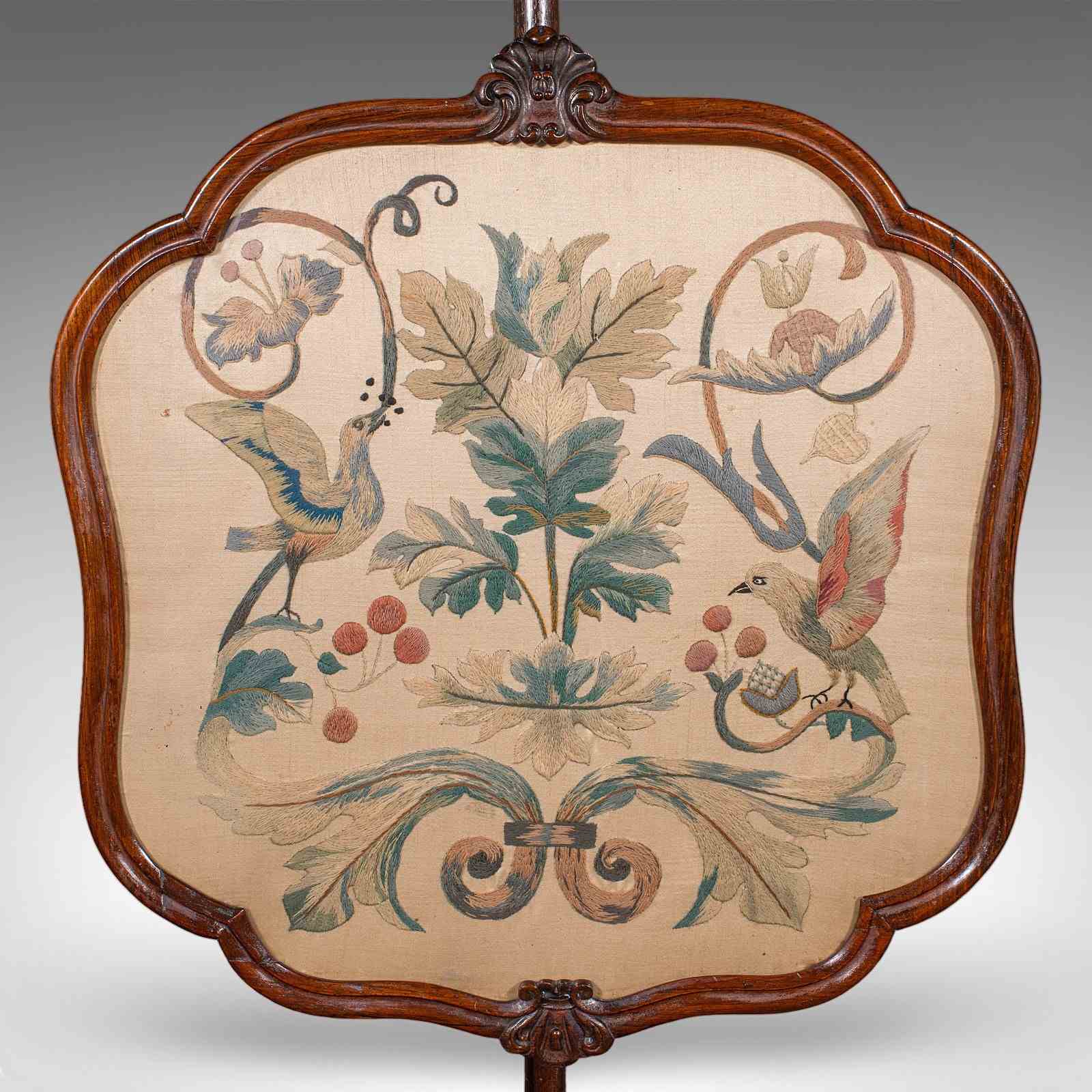 This is an antique pole screen. An English, rosewood and glass embroidered fireside heat reflector, dating to the early Victorian period, circa 1840. A beautiful example showcasing fine craftsmanship, rich materiality and exceptional decorative interest.