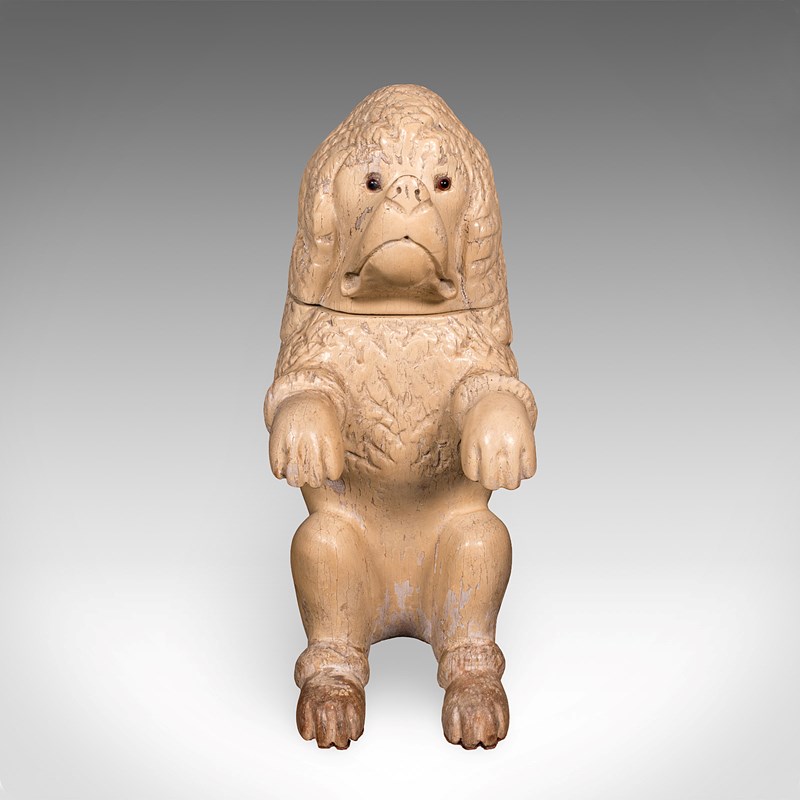 This is an antique poodle tobacco jar. An English, fruitwood dog-shaped treen, dating to the Edwardian period, circa 1910.