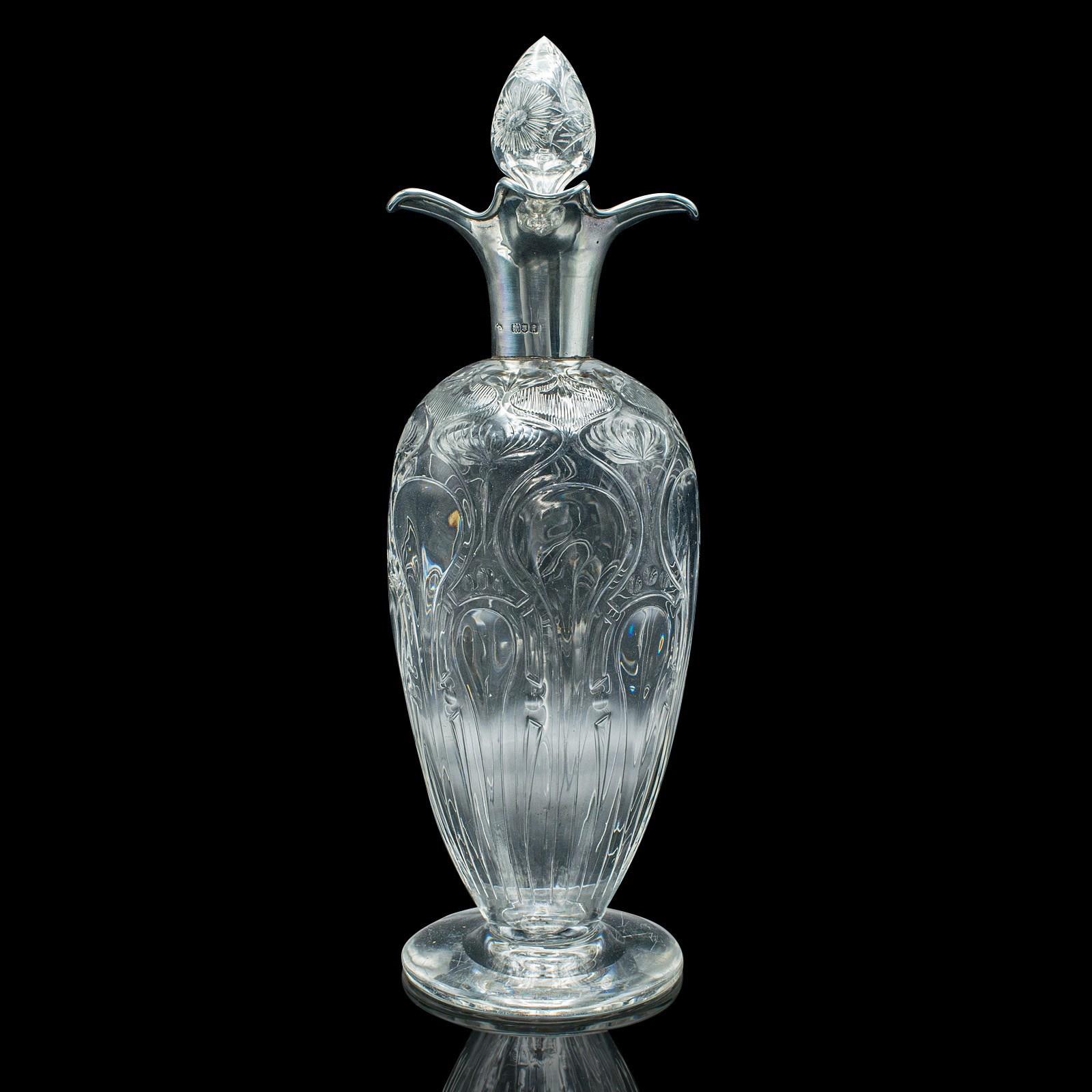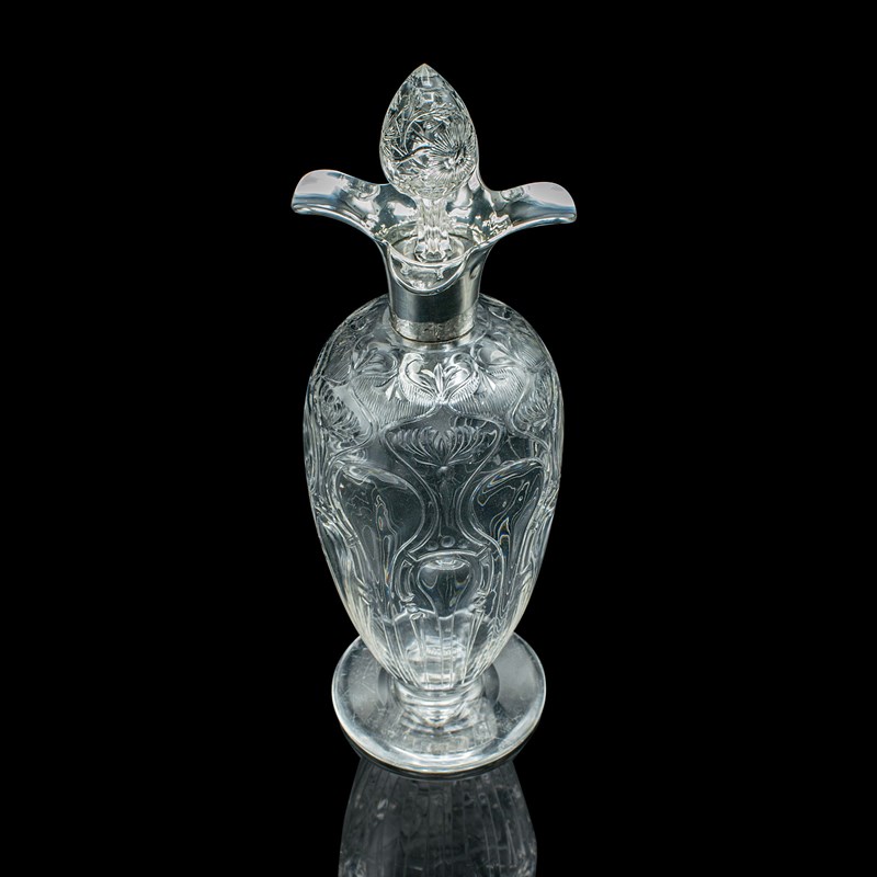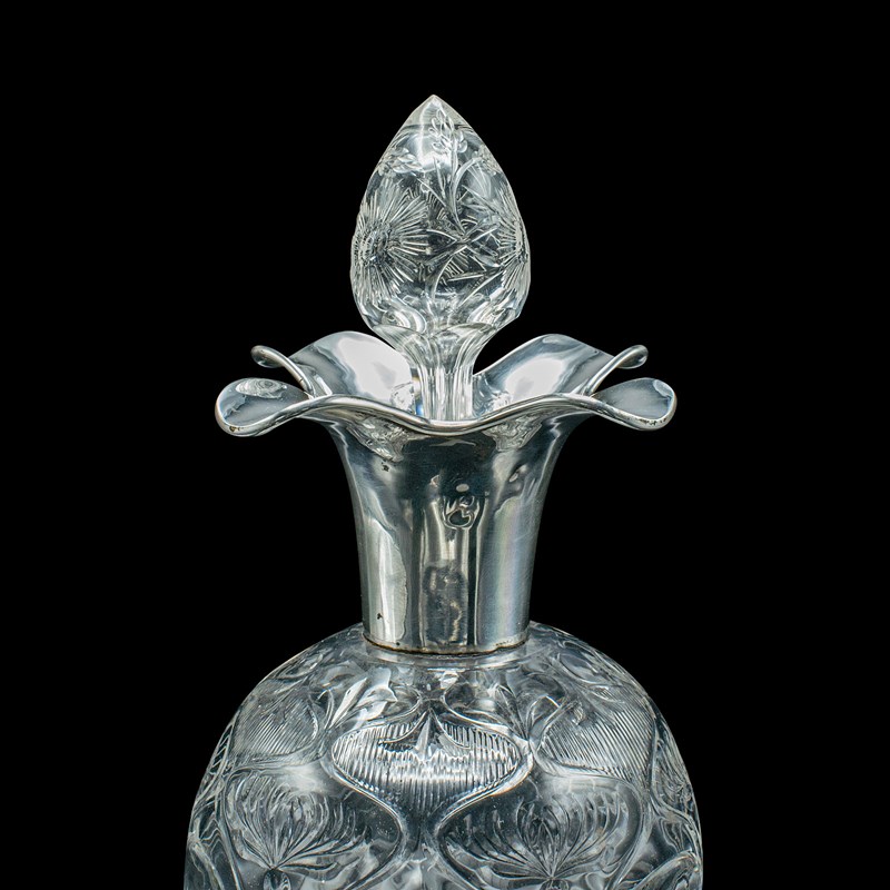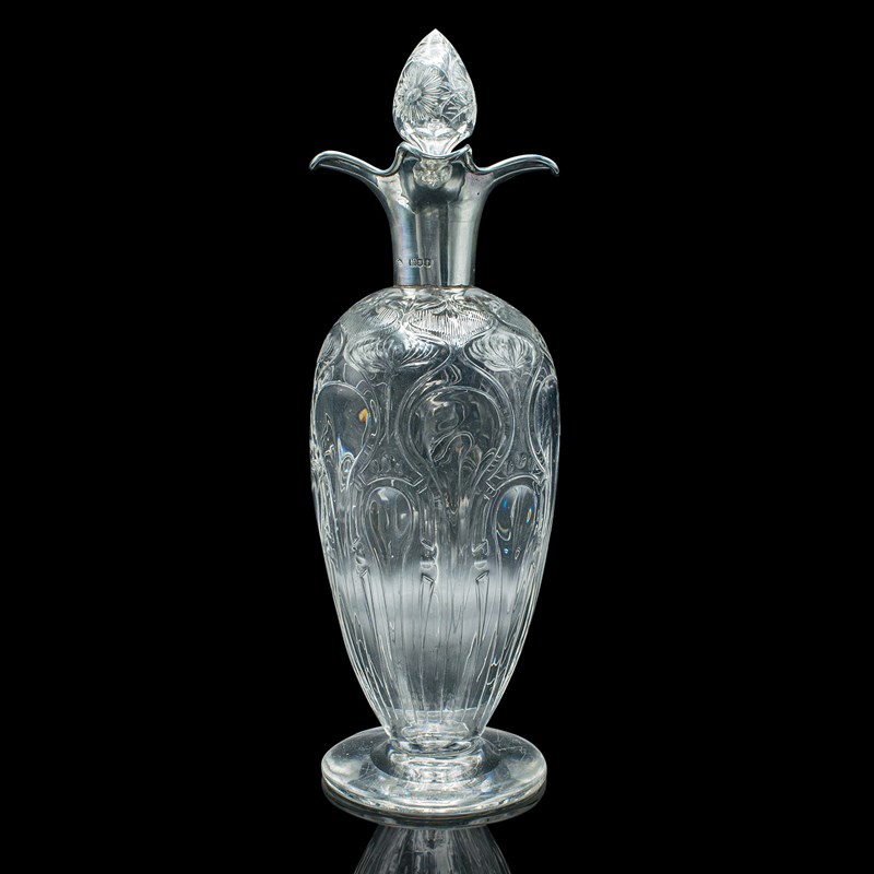 Antique Pouring Decanter, English Glass, Hallmark Silver, Art Nouveau, Edwardian