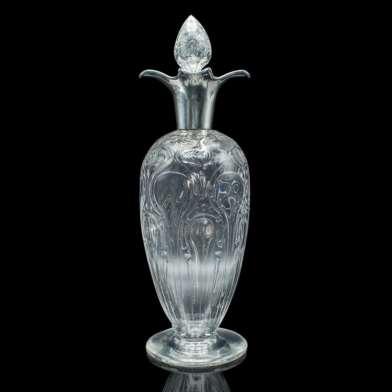 This is an antique NESW pouring decanter. An English, cut glass and silver collared spirit vessel in Art Nouveau taste, dating to the Edwardian period, hallmarked to 1904.