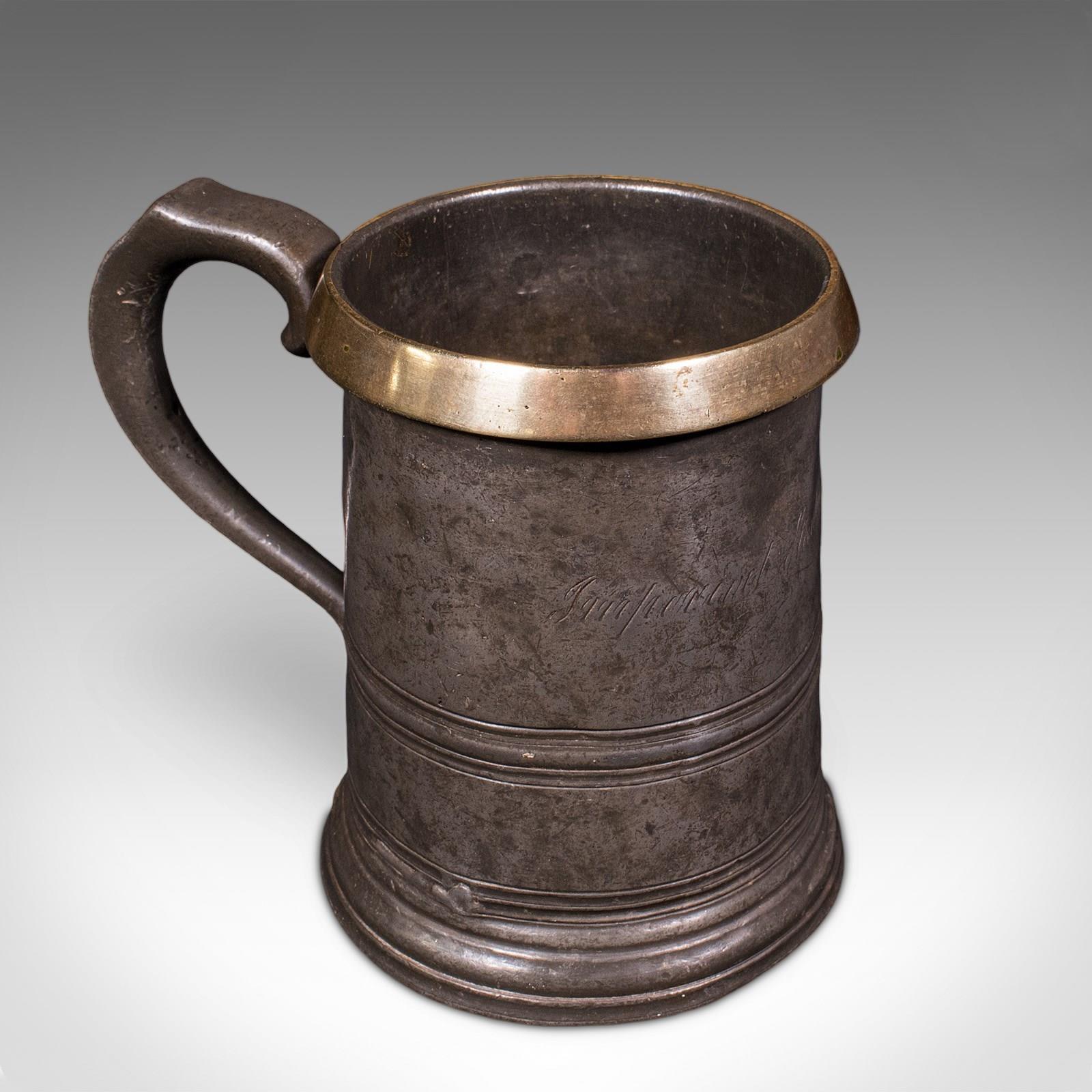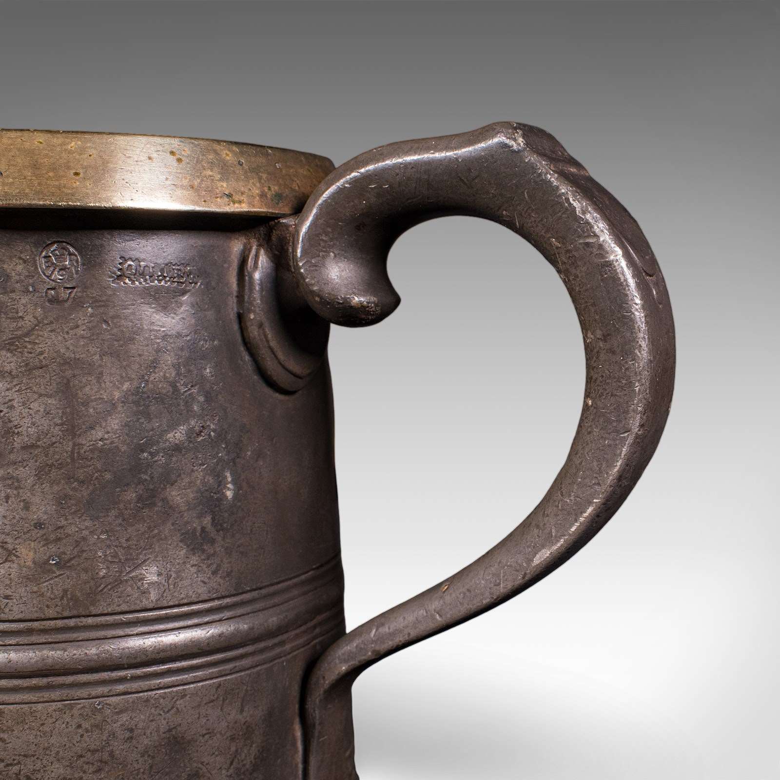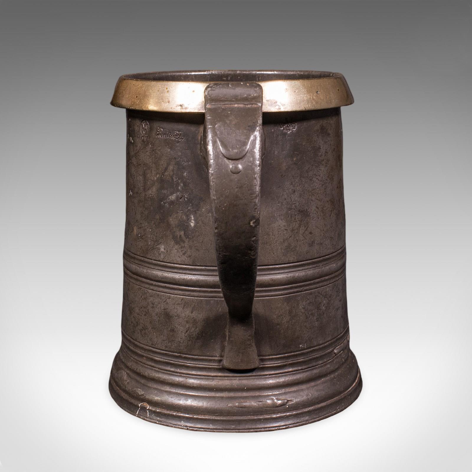 This is an antique public house tankard. An English pewter and brass quart jug, dating to the late Victorian period, circa 1890. A characterful and authentic example, rich in social history and traditional pub measure detail.