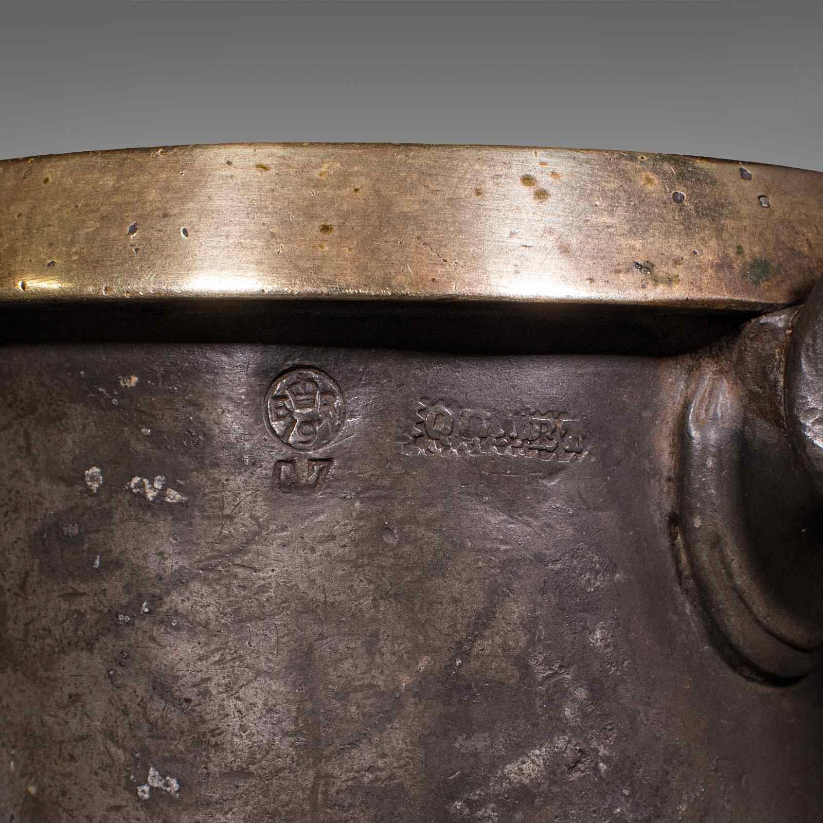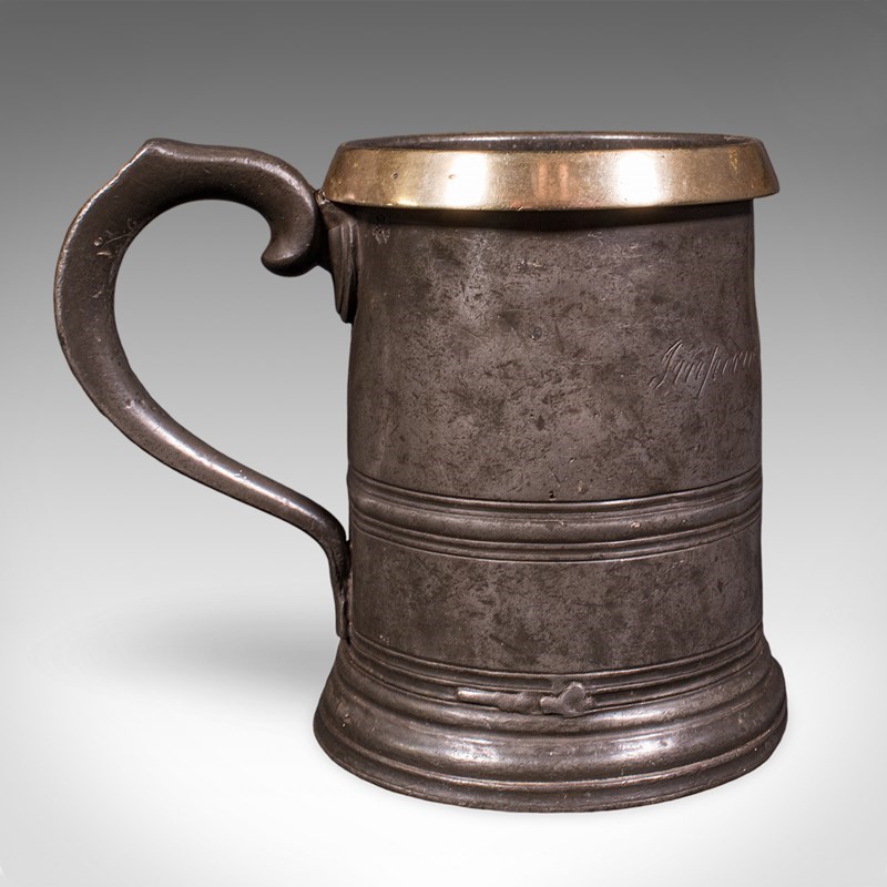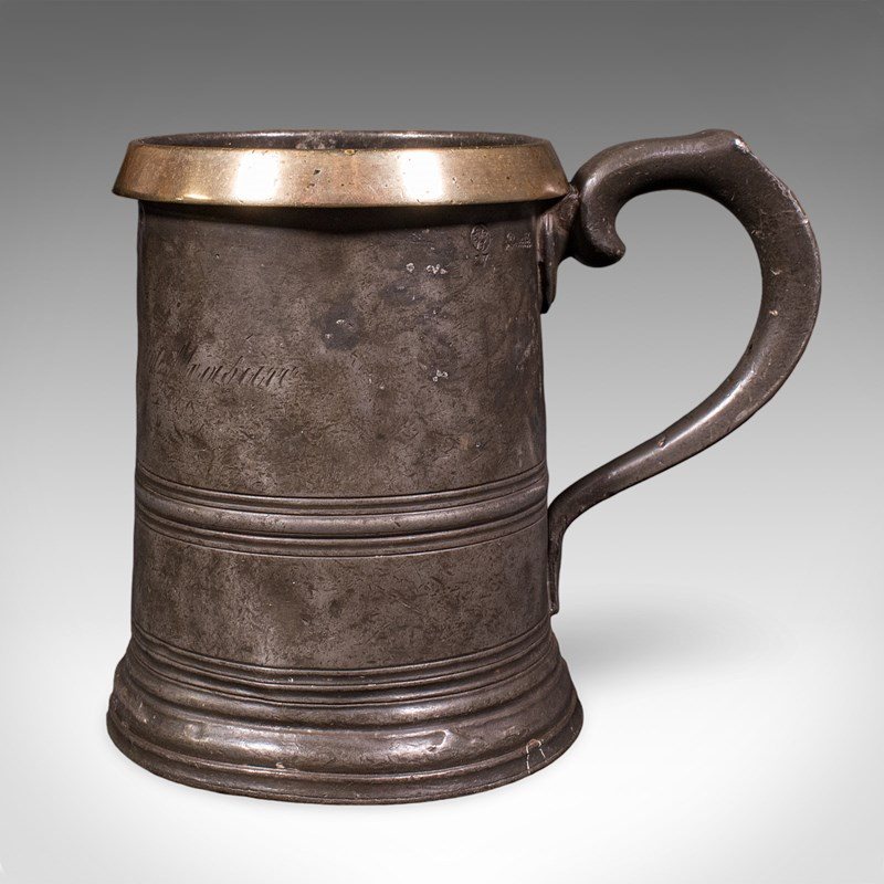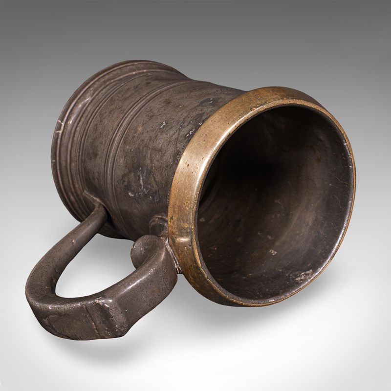 This is an antique public house tankard. An English pewter and brass quart jug, dating to the late Victorian period, circa 1890. A characterful and authentic example, rich in social history and traditional pub measure detail.