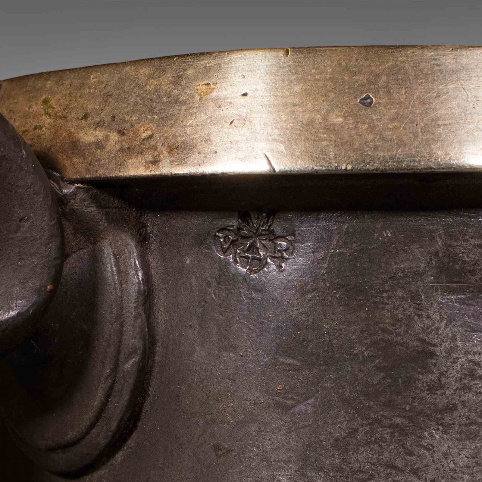 Polished brass rim presents subtle golden tones, contrasting with the weathered pewter
