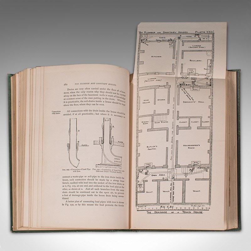 A fascinating late 19th century volume of architectural and practical interest across 431 pages, reflecting the Victorian era’s growing focus upon sanitation, plumbing practice and domestic health.