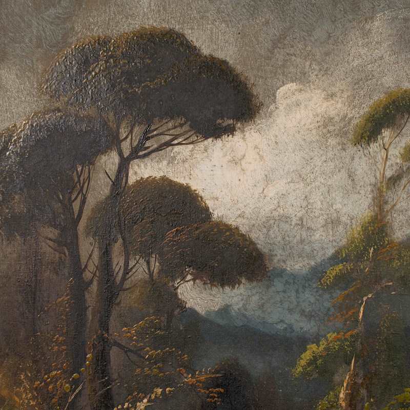 - Oil on canvas set within a bright gilt frame, with decorative edge moulding