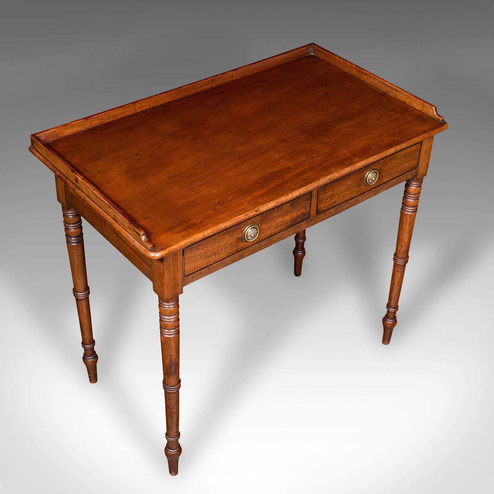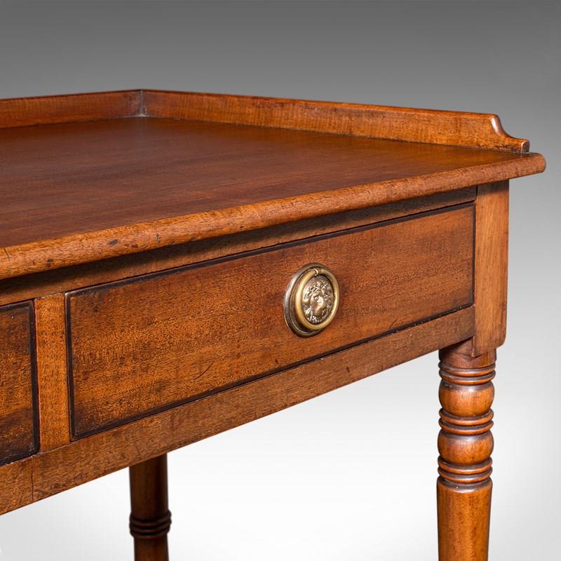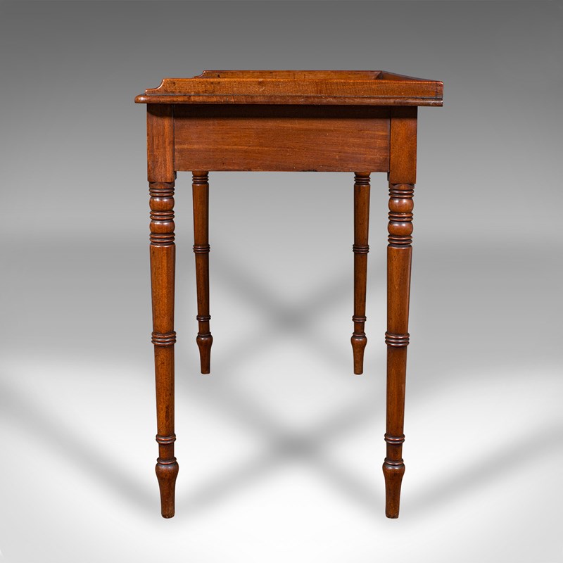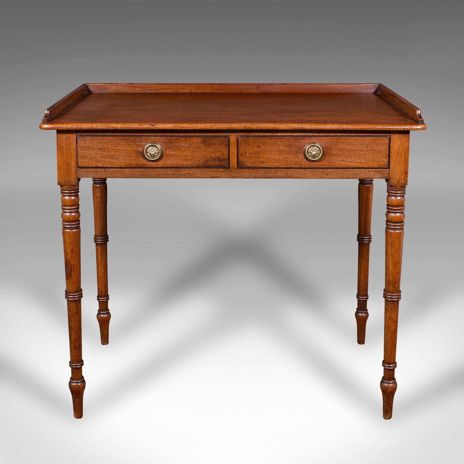 This is an antique scholar's desk. An English, mahogany writing or side table, dating to the Regency period, circa 1820. A delightful example of refined design and enduring craftsmanship, with elegant proportions and rich tone.