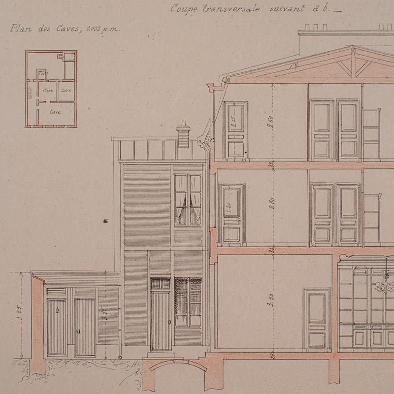This is a delightful framed set of architectural plans. In period, architects used such plans for inspiration, and the volumes from which they came are scarce and celebrated. A treat for Francophiles or architects alike, delivered ready to display.