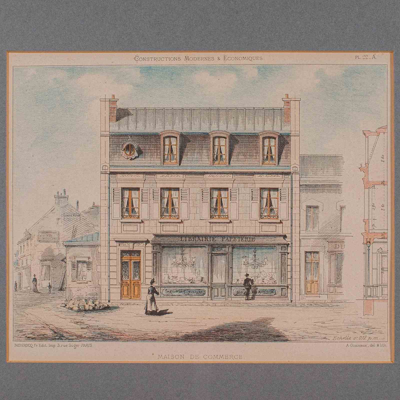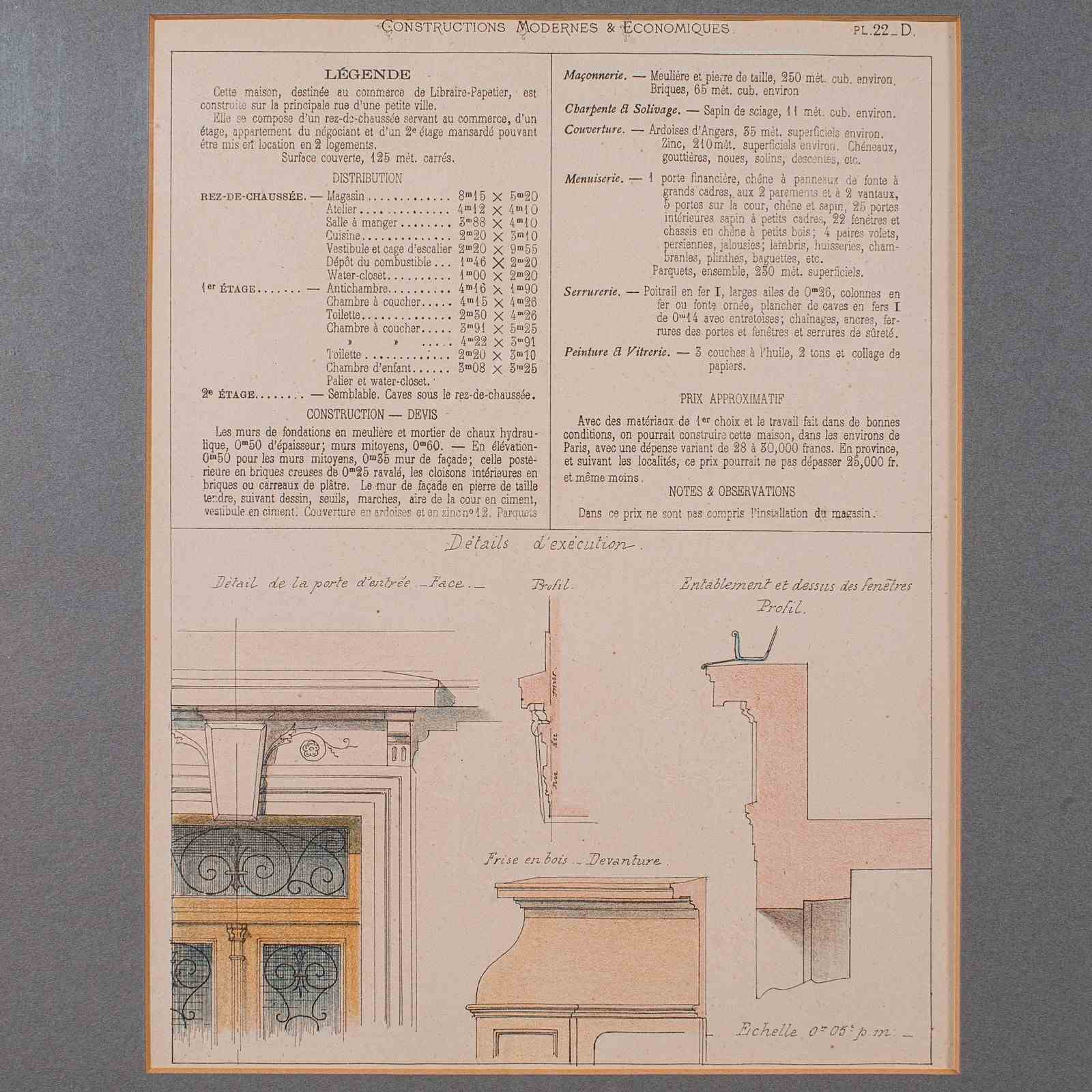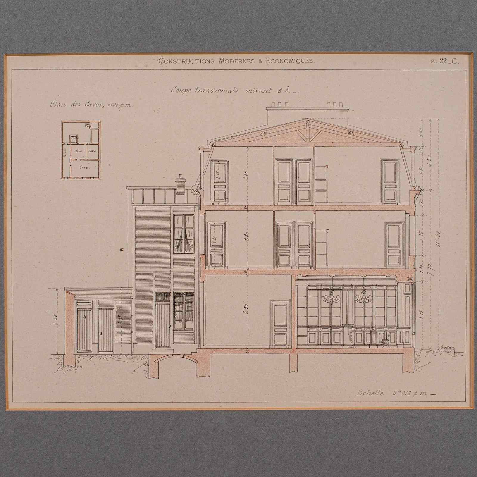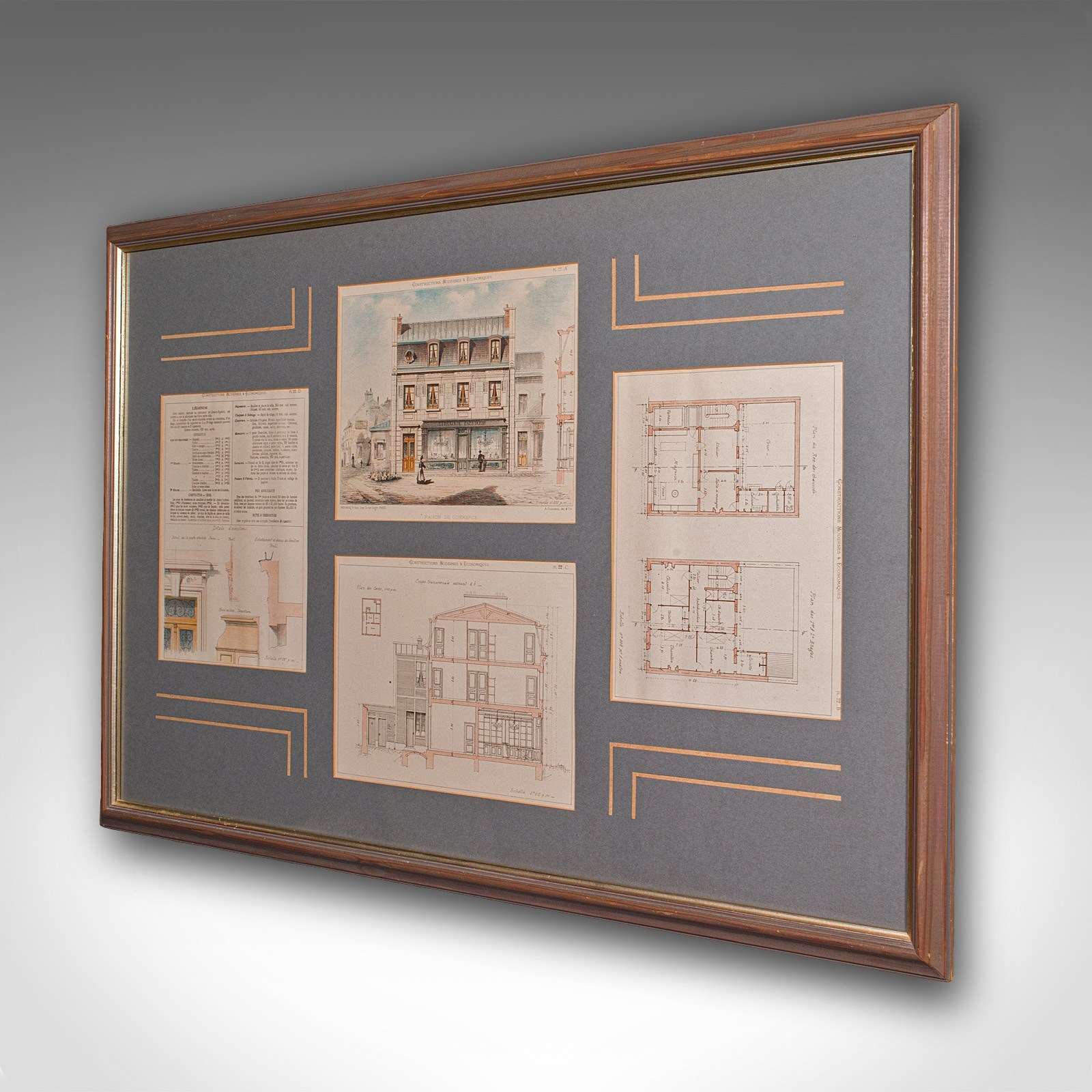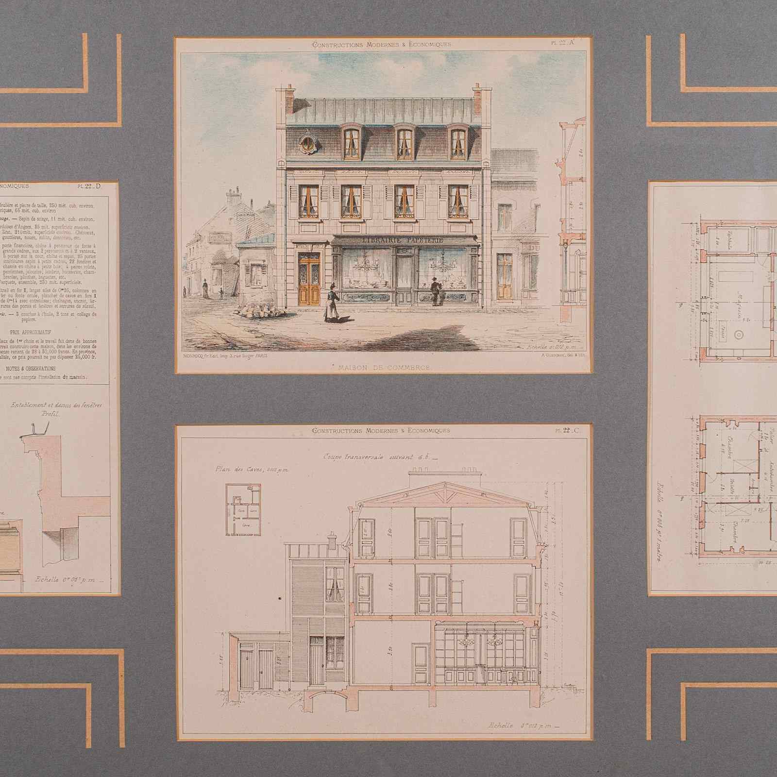 This is an antique framed set of architectural plans. A French, lithograph display of drawings from Constructions Modernes et Economiques, dating to the late Victorian period, circa 1900.