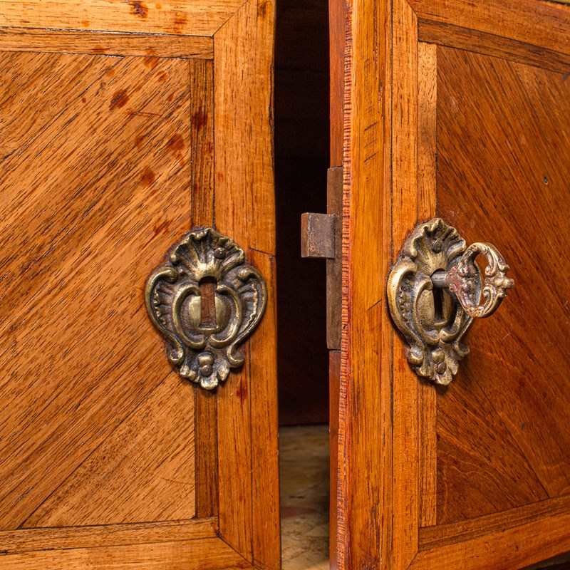 Opens to reveal a marble-lined cupboard, maintaining a cool interior ambience ideal for personal items