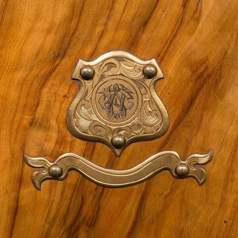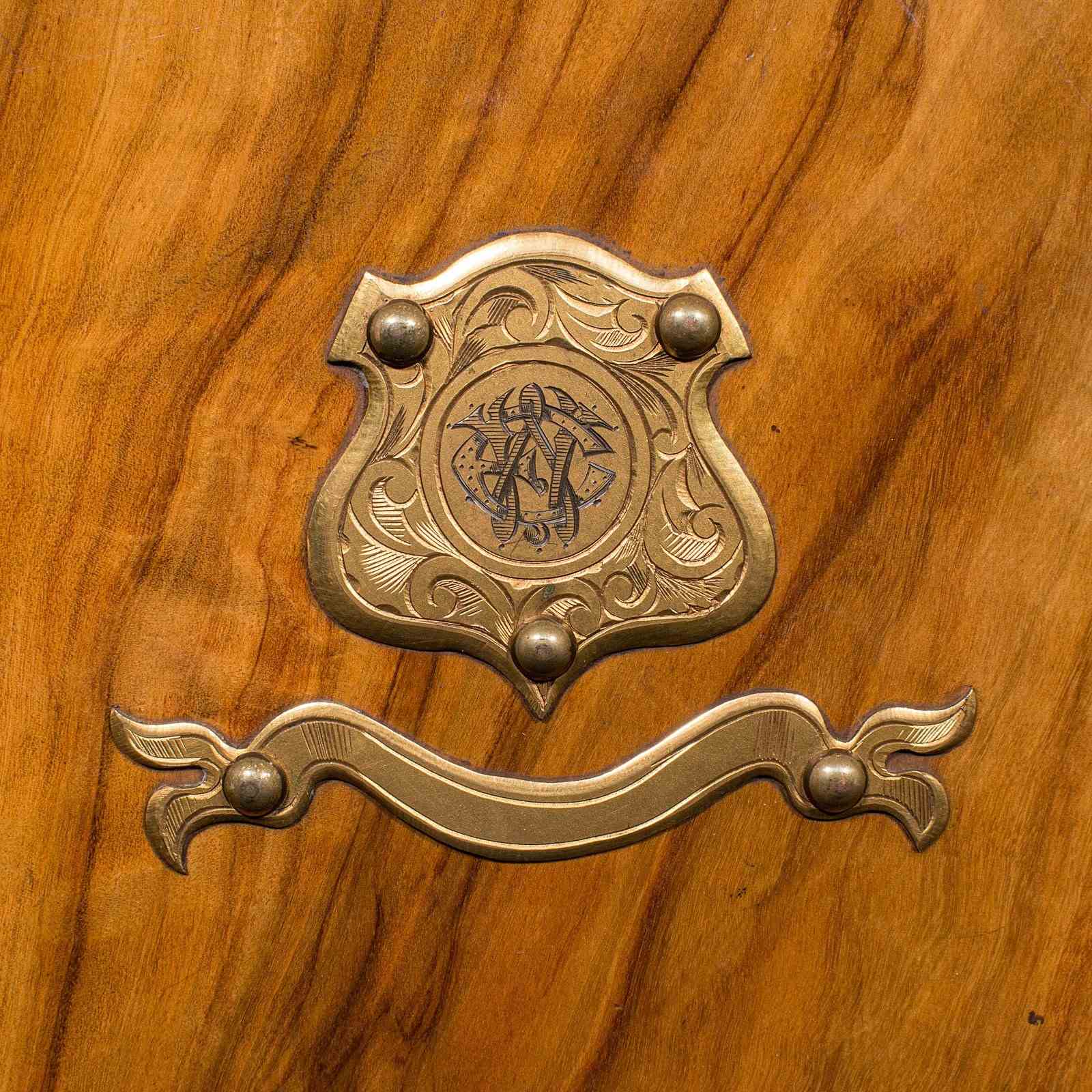 This is an antique sommelier's wine list folio. A French, walnut and brass decorative menu or document sleeve, dating to the late Victorian period, circa 1900.