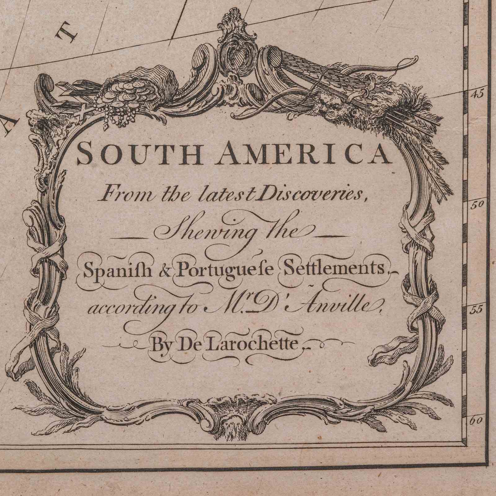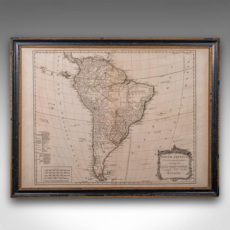 This is a superb antique map of South America. An English, framed cartographic engraving by Louis Stanislas De La Rochette, dating to the Georgian period and later, circa 1790. A fascinating example of late 18th century mapping, elegantly presented for display.