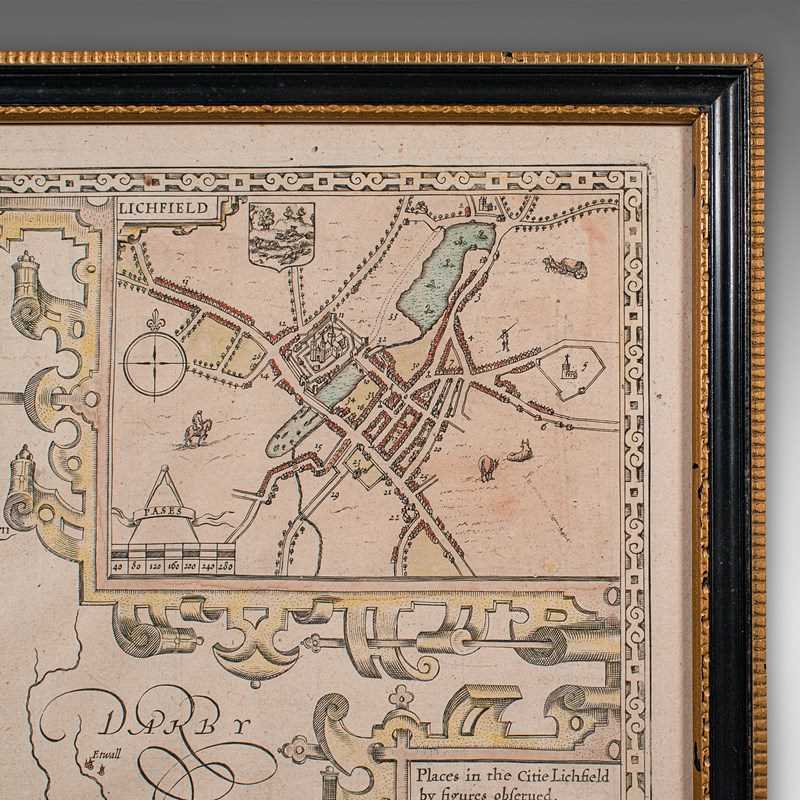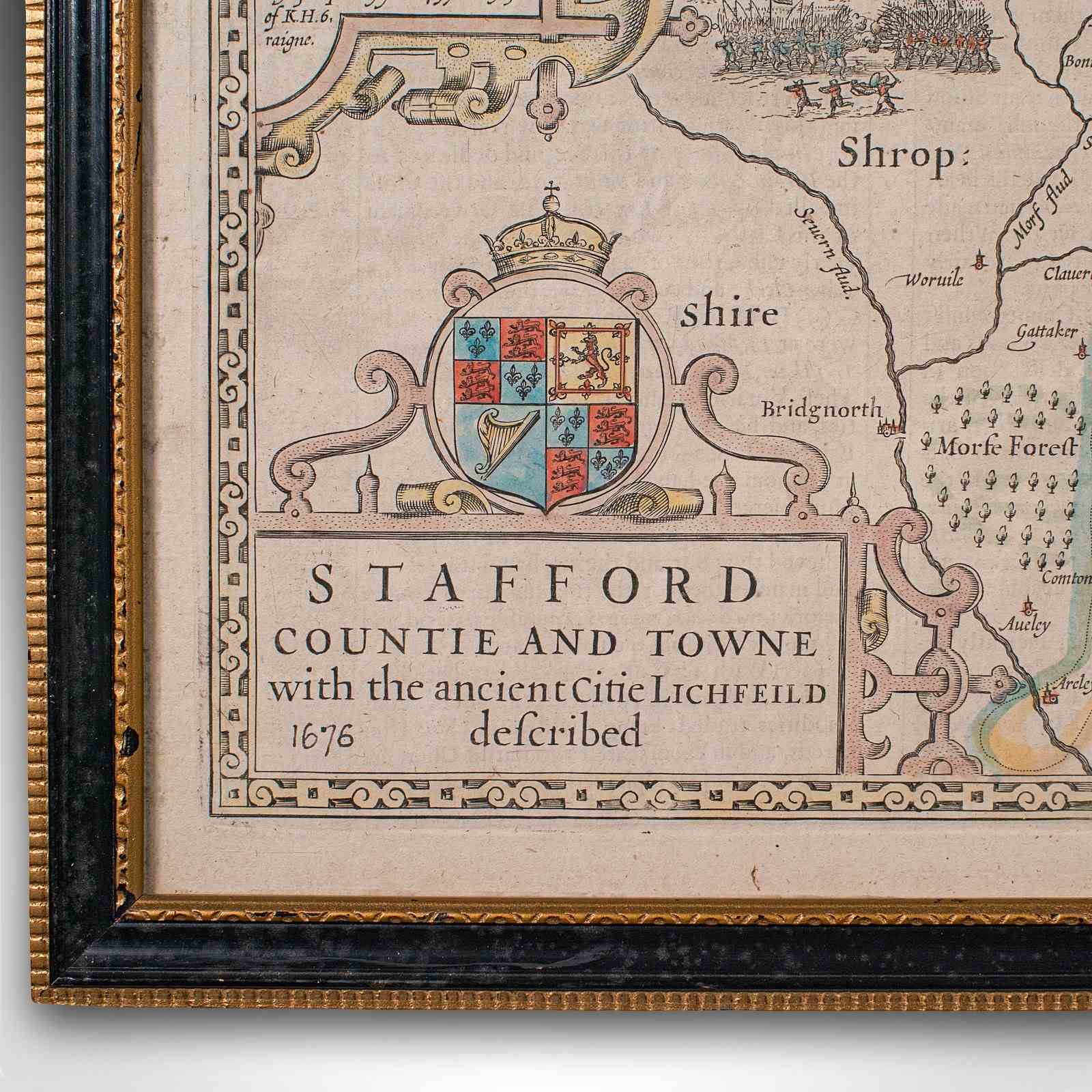 This is an antique Stafford County Map. An English, framed atlas engraving of Staffordshire, dating to the 17th century and later, circa 1676.