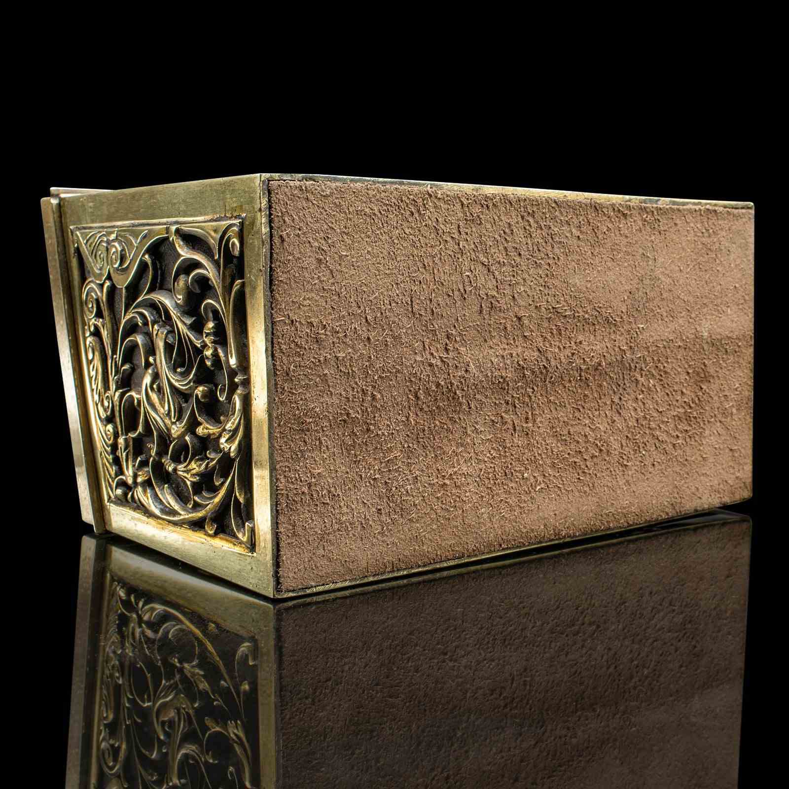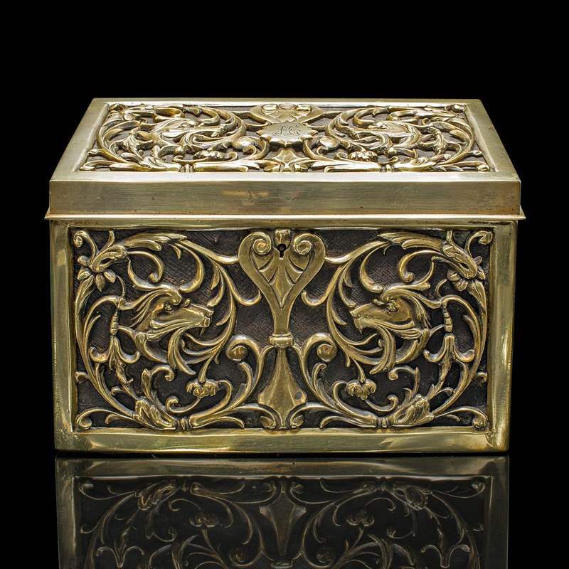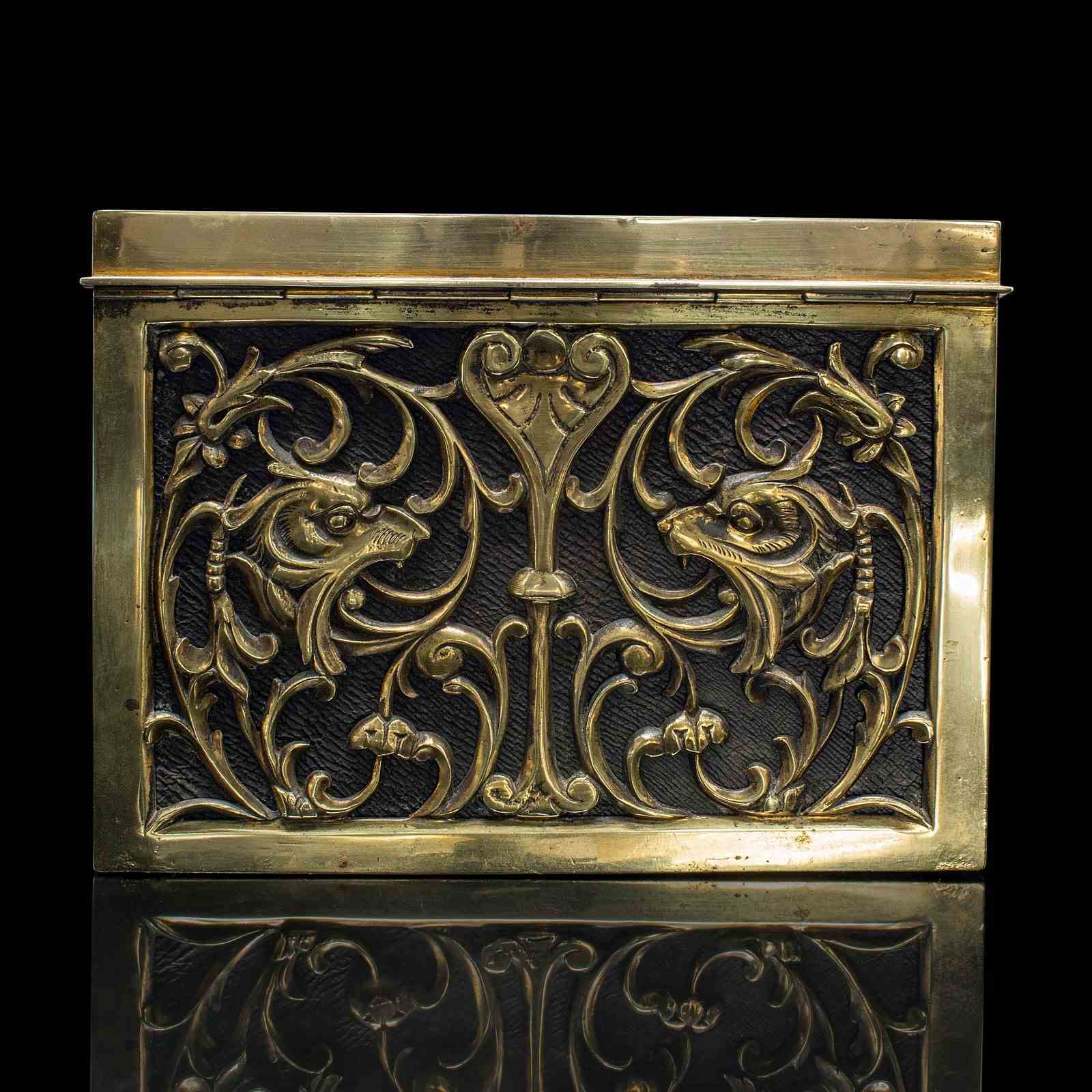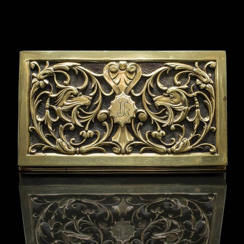 This antique brass stationery box is a statement piece, combining practicality and decorative charm. A distinctive addition to any writing desk, study, or collector’s cabinet. Delivered ready for the home or institution.