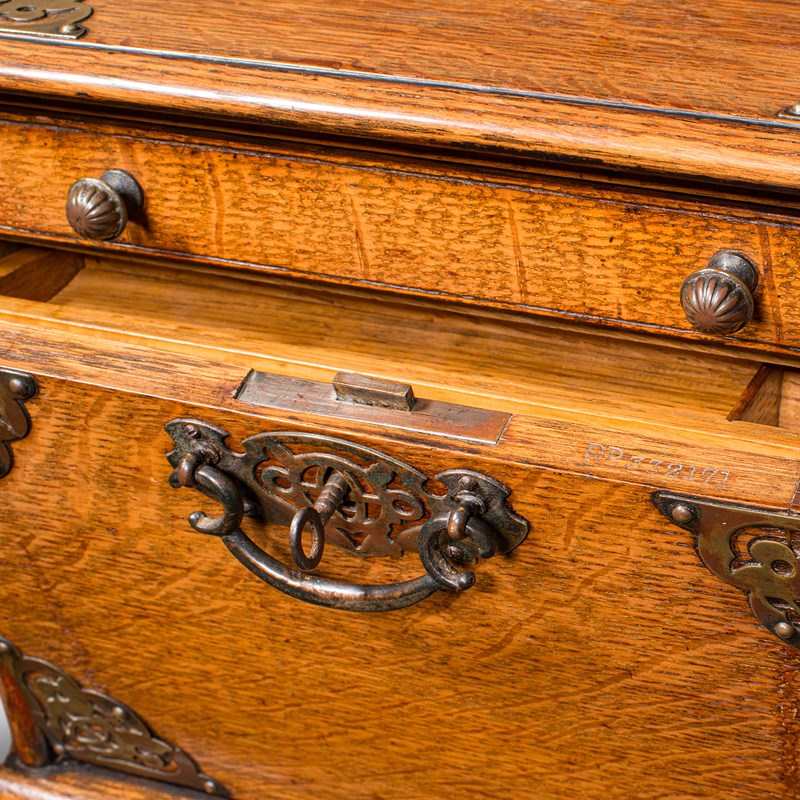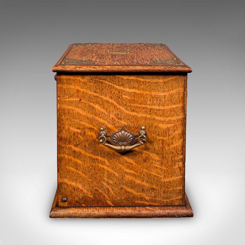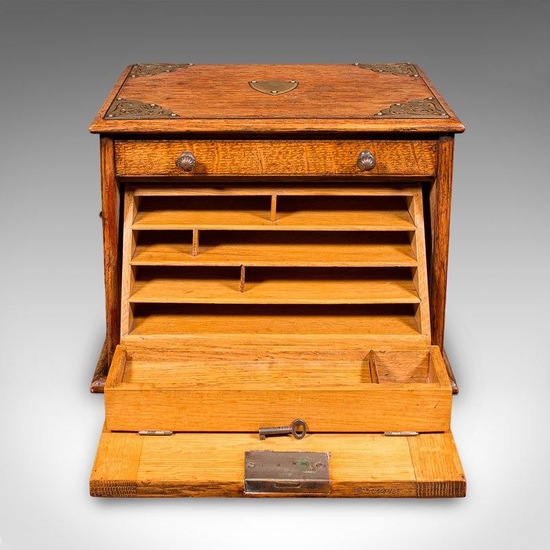 Antique Stationery Box, English, Golden Oak, Fall Front Desk Tidy, Edwardian