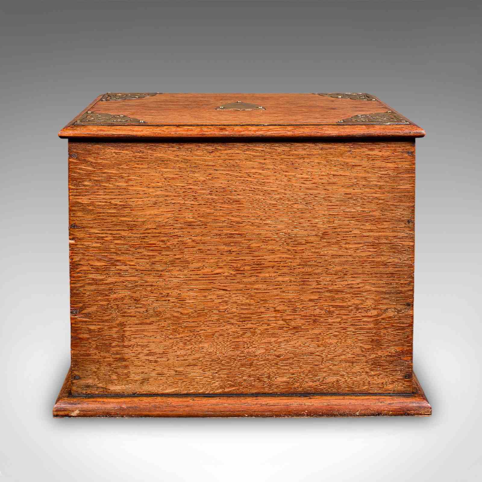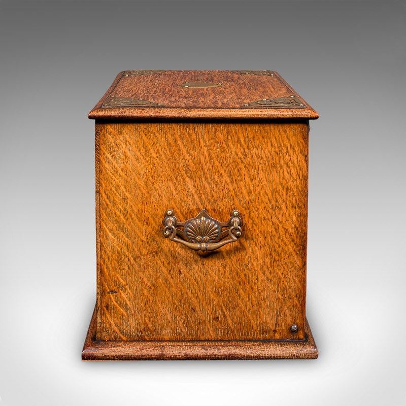 This is an antique stationery box. An English, golden oak and brass fall front desk tidy, dating to the Edwardian period, circa 1910.