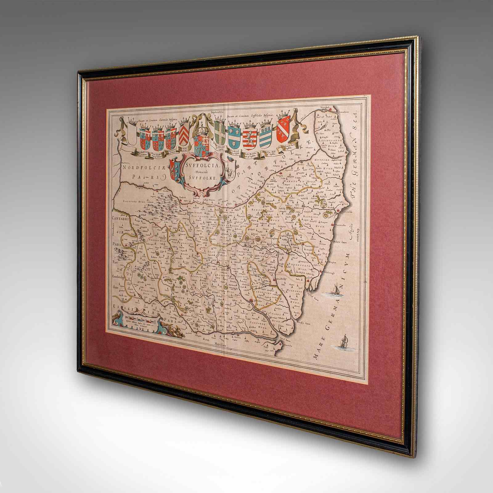 This is an antique county map of Suffolk. A Dutch, framed atlas engraving by Joan Blaeu, dating to the 17th century and later.