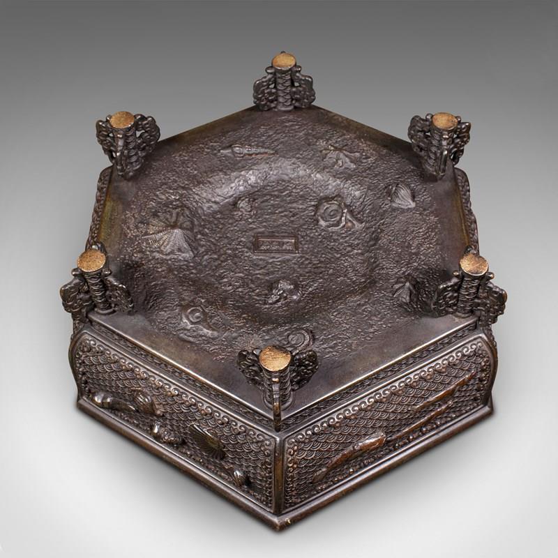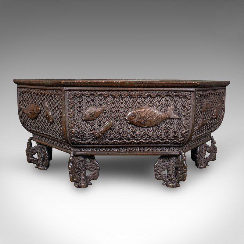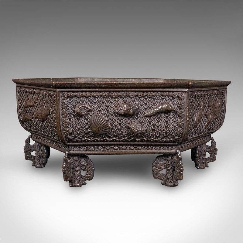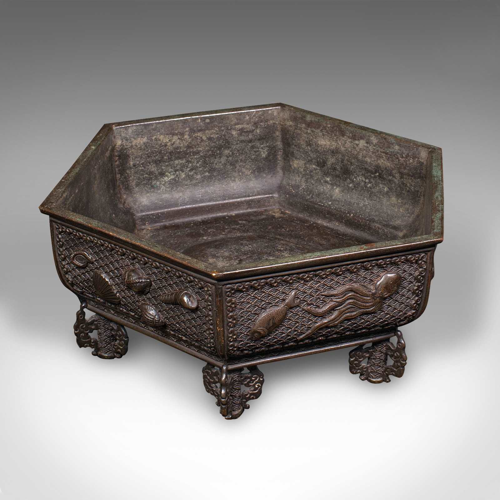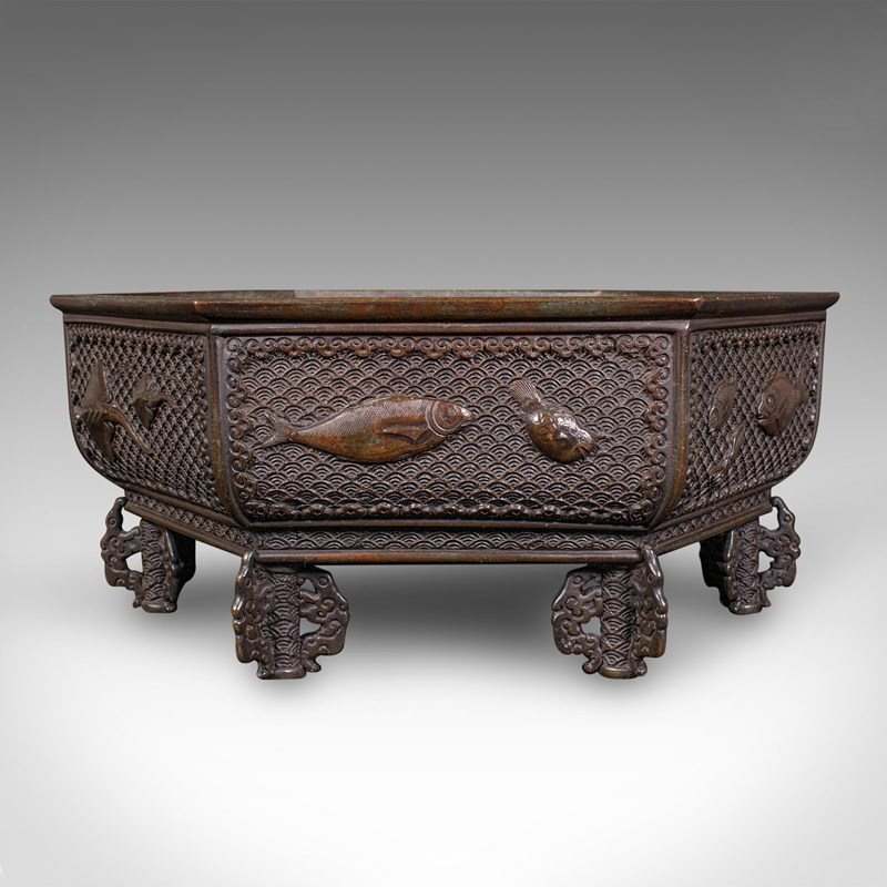 A rare and highly decorative Suiban jardiniere, rich with symbolism and quality, this piece would make a fine centrepiece for a bonsai display, or a captivating addition to a collection of Japanese bronzes or Edo period artefacts. Delivered ready to display.