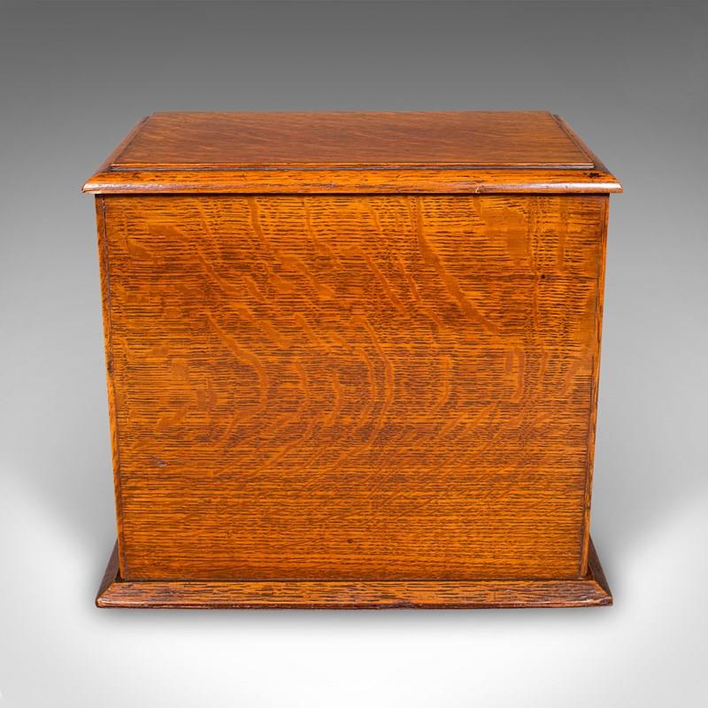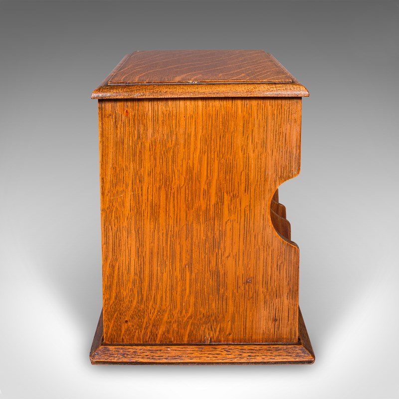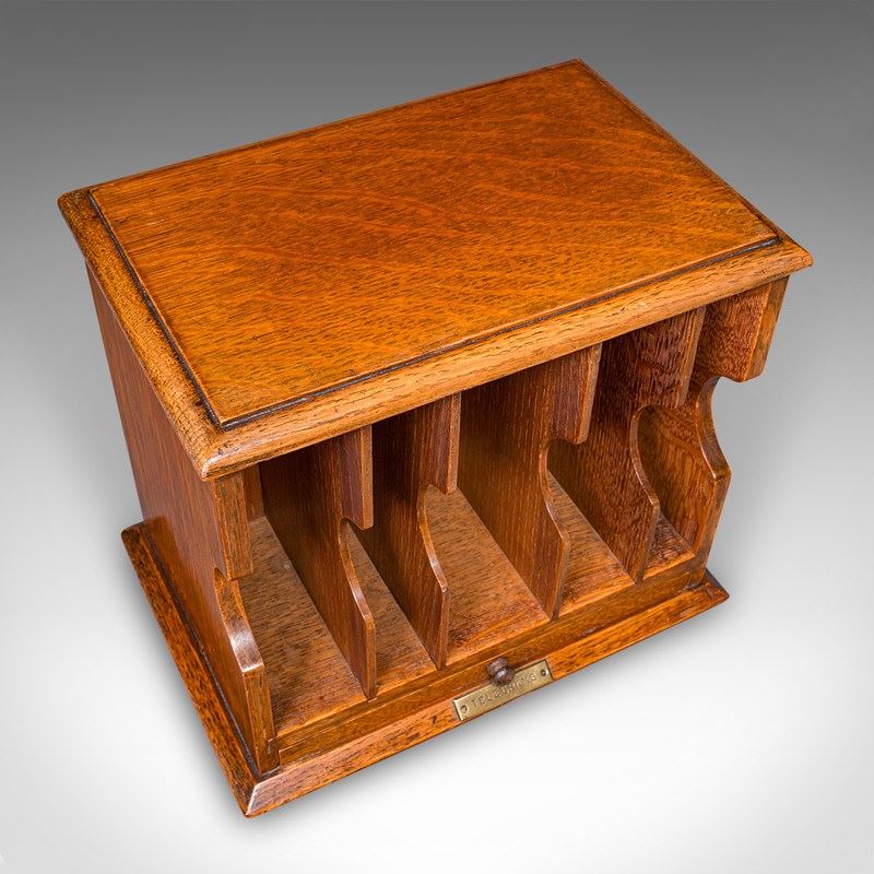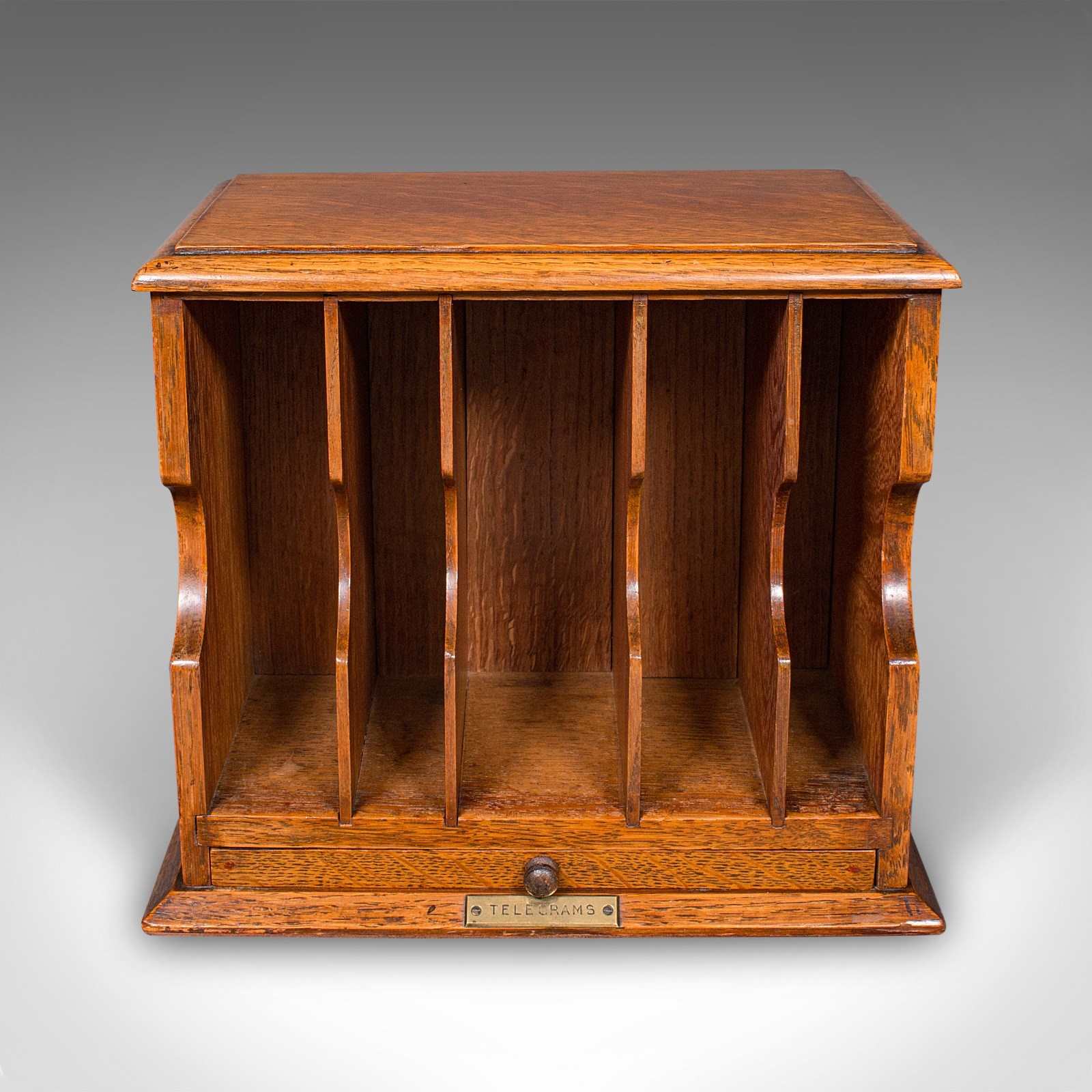 This is an antique telegram case. An English, oak letter organiser or stationery box, dating to the late Victorian period, circa 1900. A delightful example of period craftsmanship, with fine figuring and superb practicality.